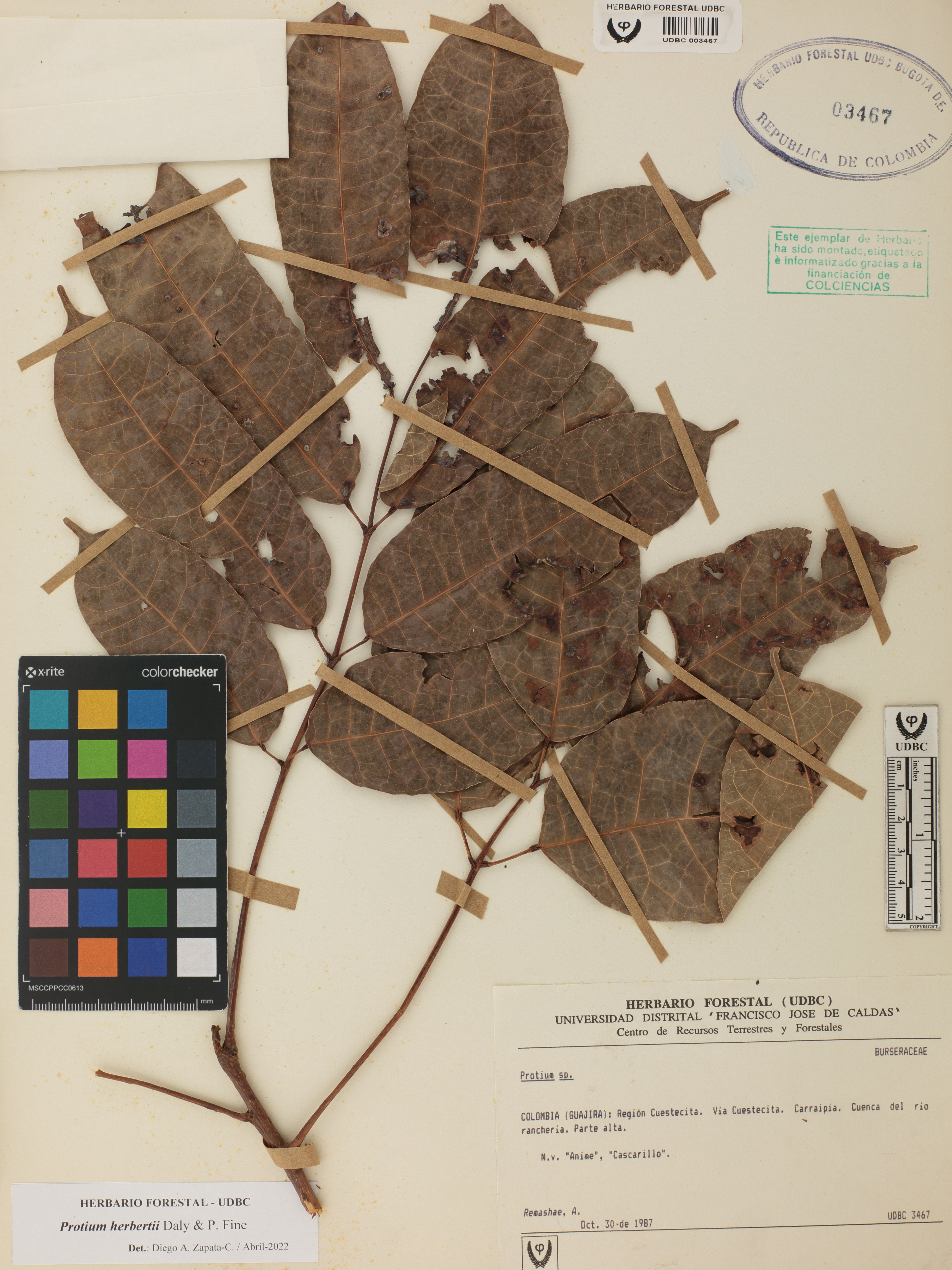 Fotografía del ejemplar Remashae, A., determinado como Protium herbertii en el año 2022