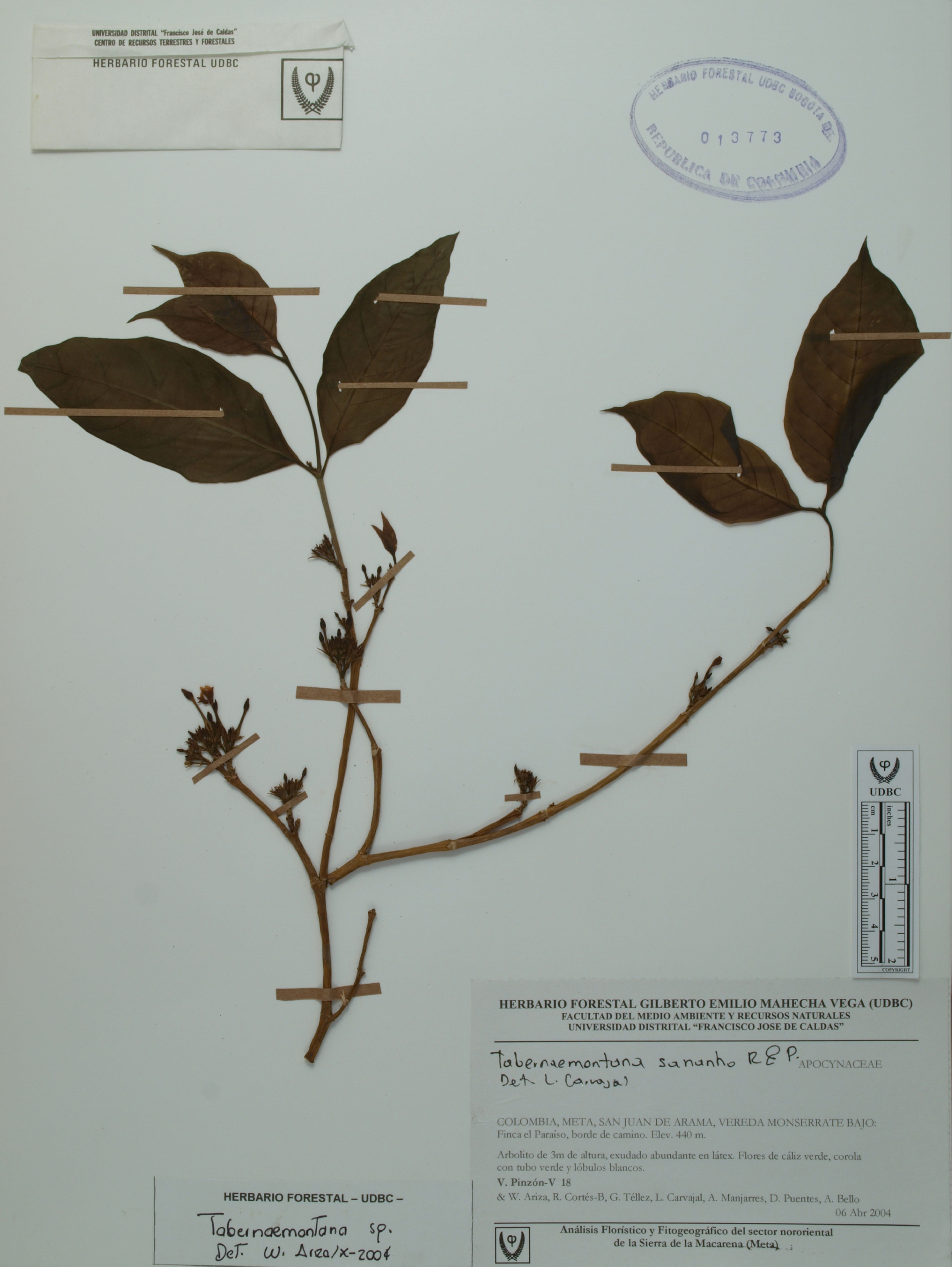 Fotografía del ejemplar Pinzón-V., V. 18, determinado como Tabernaemontana heterophylla en el año 2017
