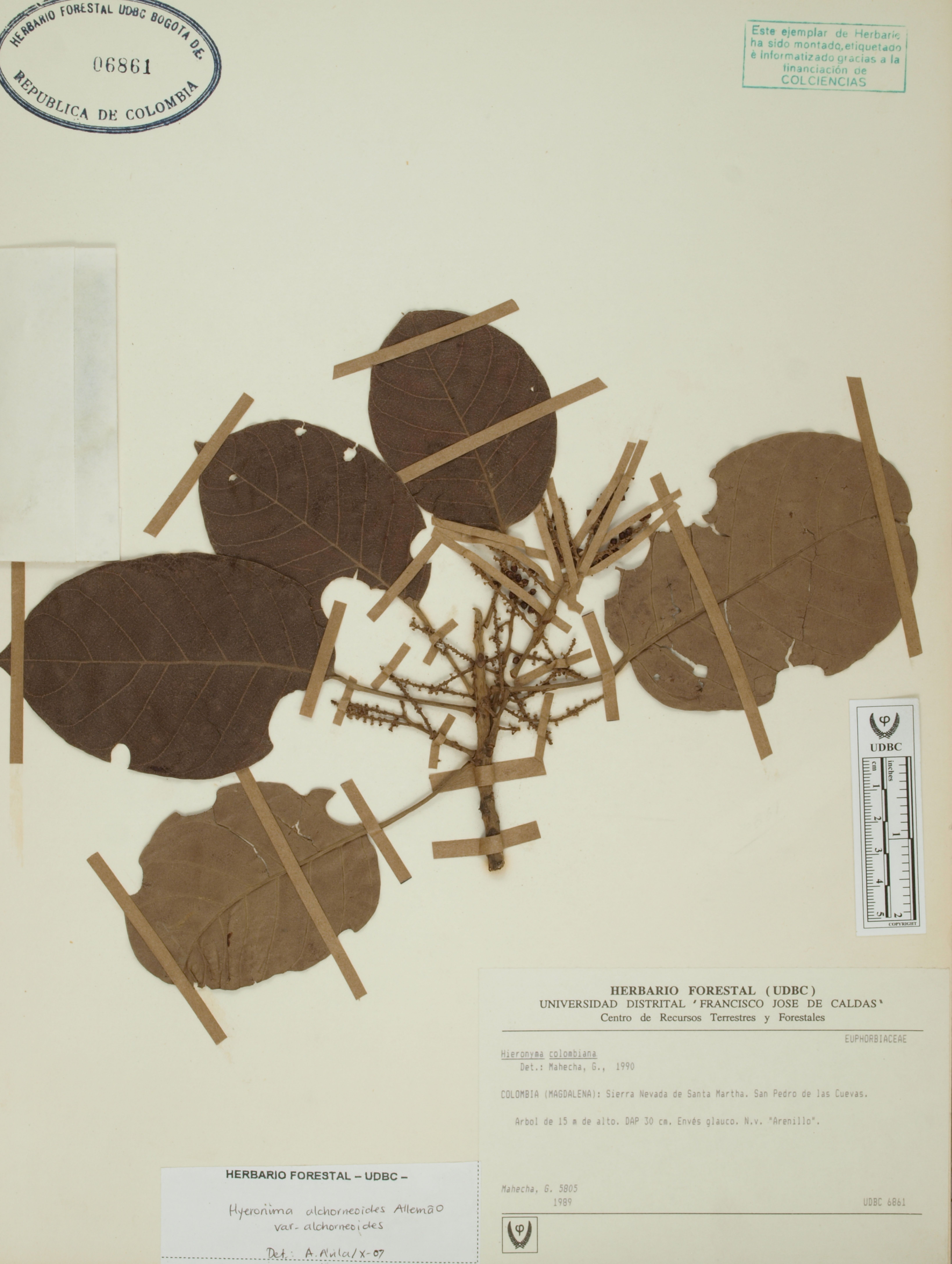 Fotografía del ejemplar Mahecha, G. 5805, determinado como Hieronyma alchorneoides var. alchorneoides en el año 2007