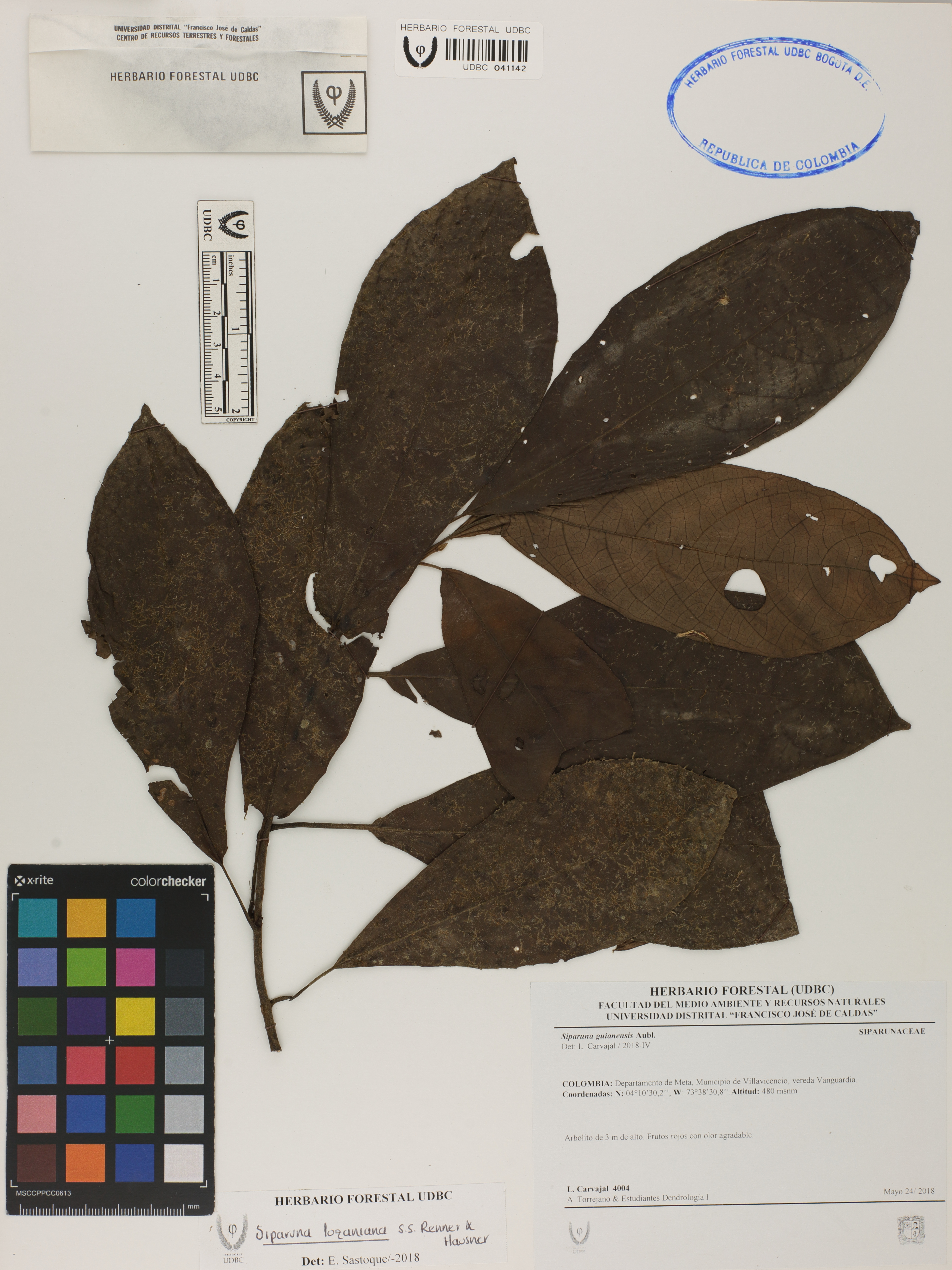 Fotografía del ejemplar Carvajal, L. 4004, determinado como Siparuna lozaniana en el año 2018