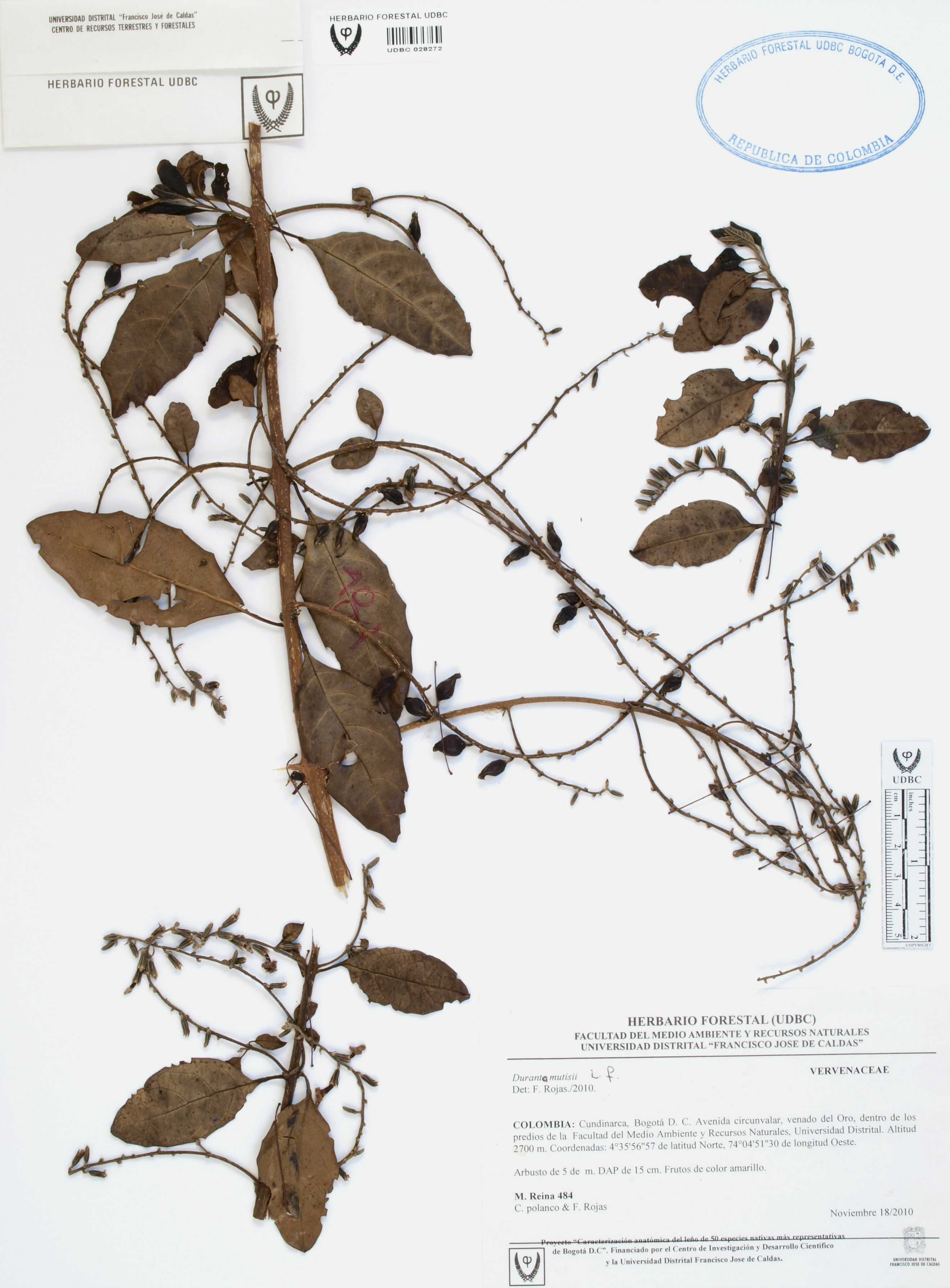 Fotografía del ejemplar Reina, M. 484, determinado como Duranta mutisii en el año 2010
