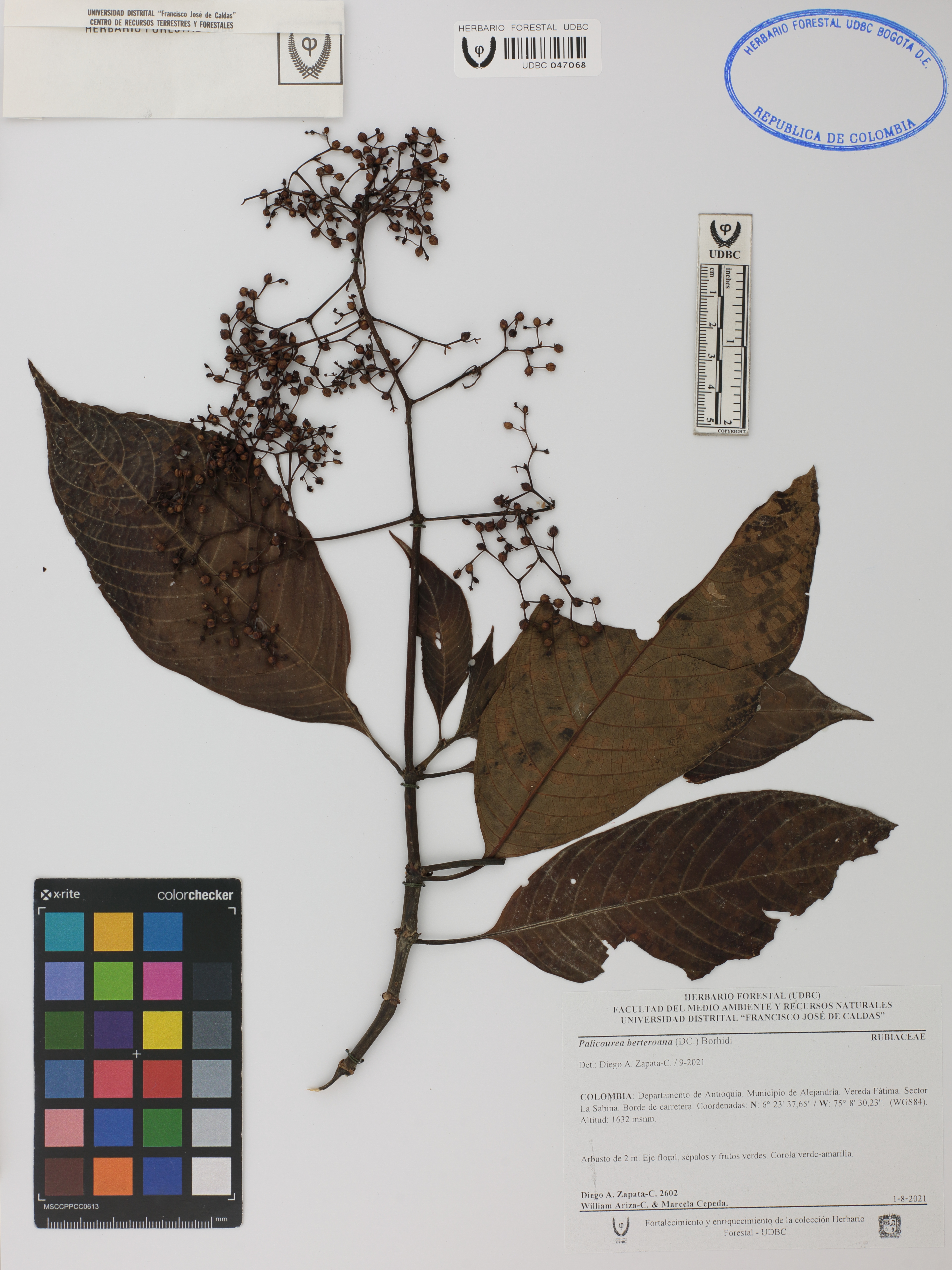Fotografía del ejemplar Zapata-C., D. 2602, determinado como Palicourea berteroana en el año 2021