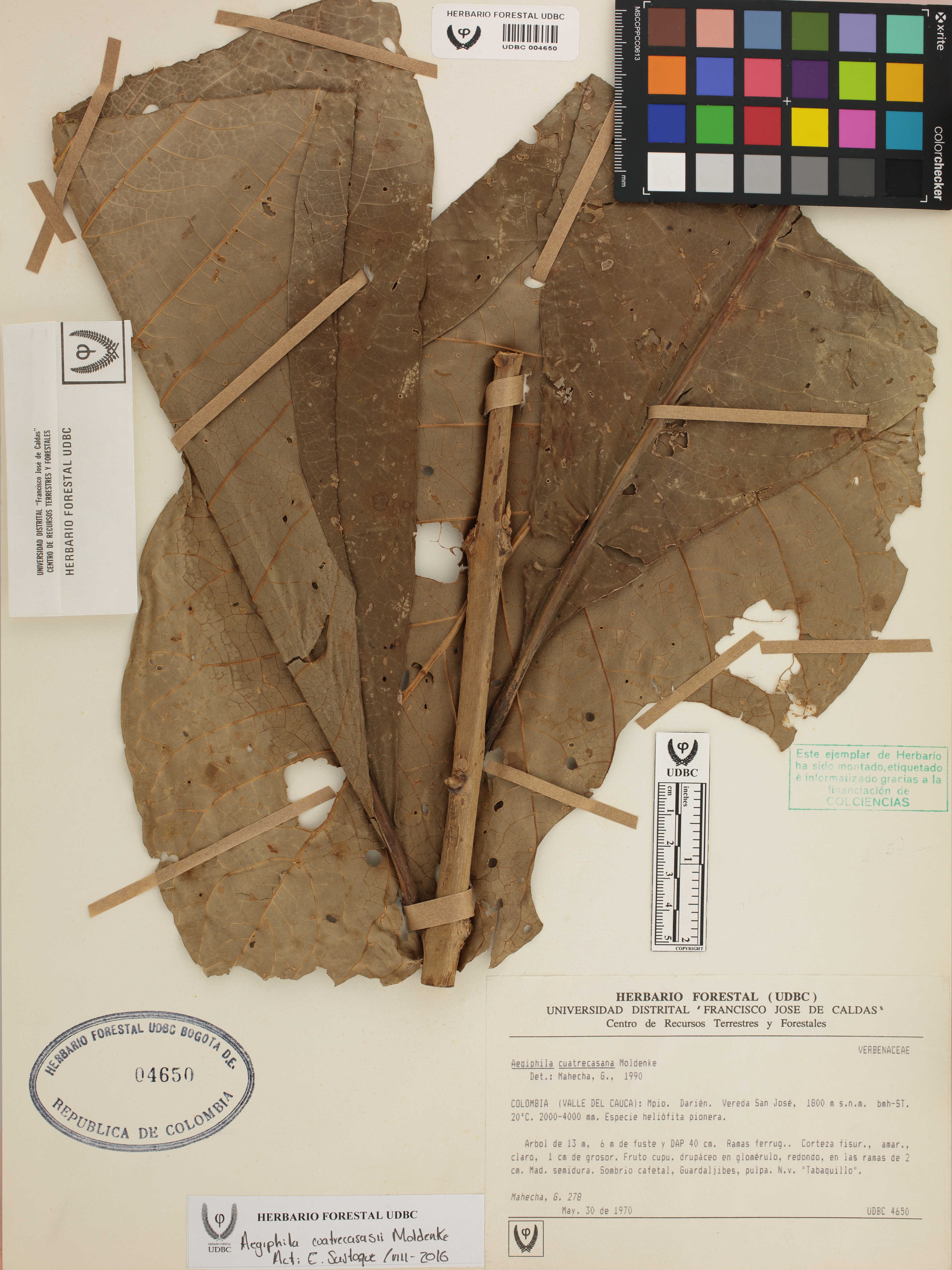 Fotografía del ejemplar Mahecha, G. 278, determinado como Aegiphila cuatrecasasii en el año 1990