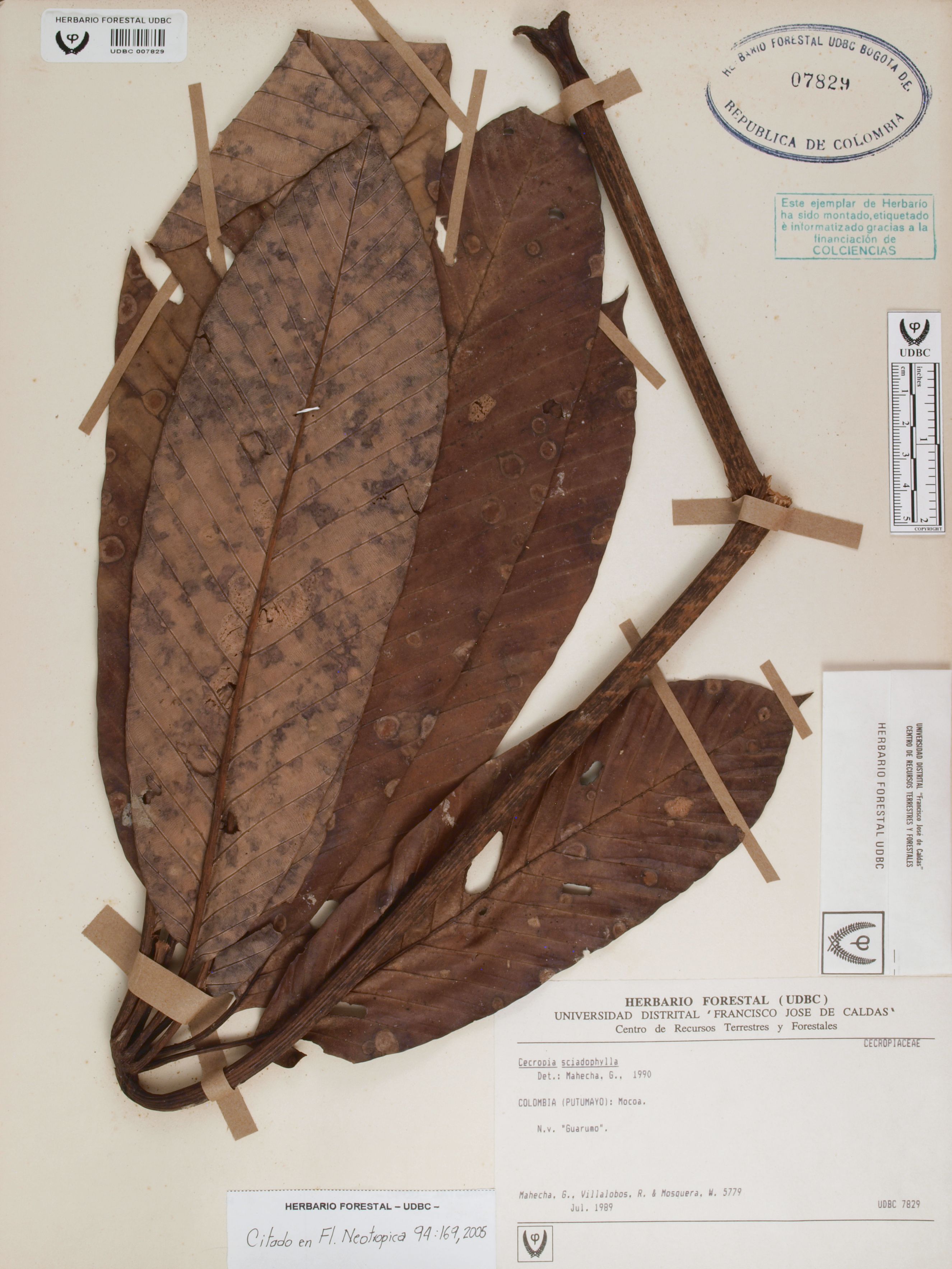 Fotografía del ejemplar Mahecha, G. 5779, determinado como Cecropia sciadophylla en el año 1990