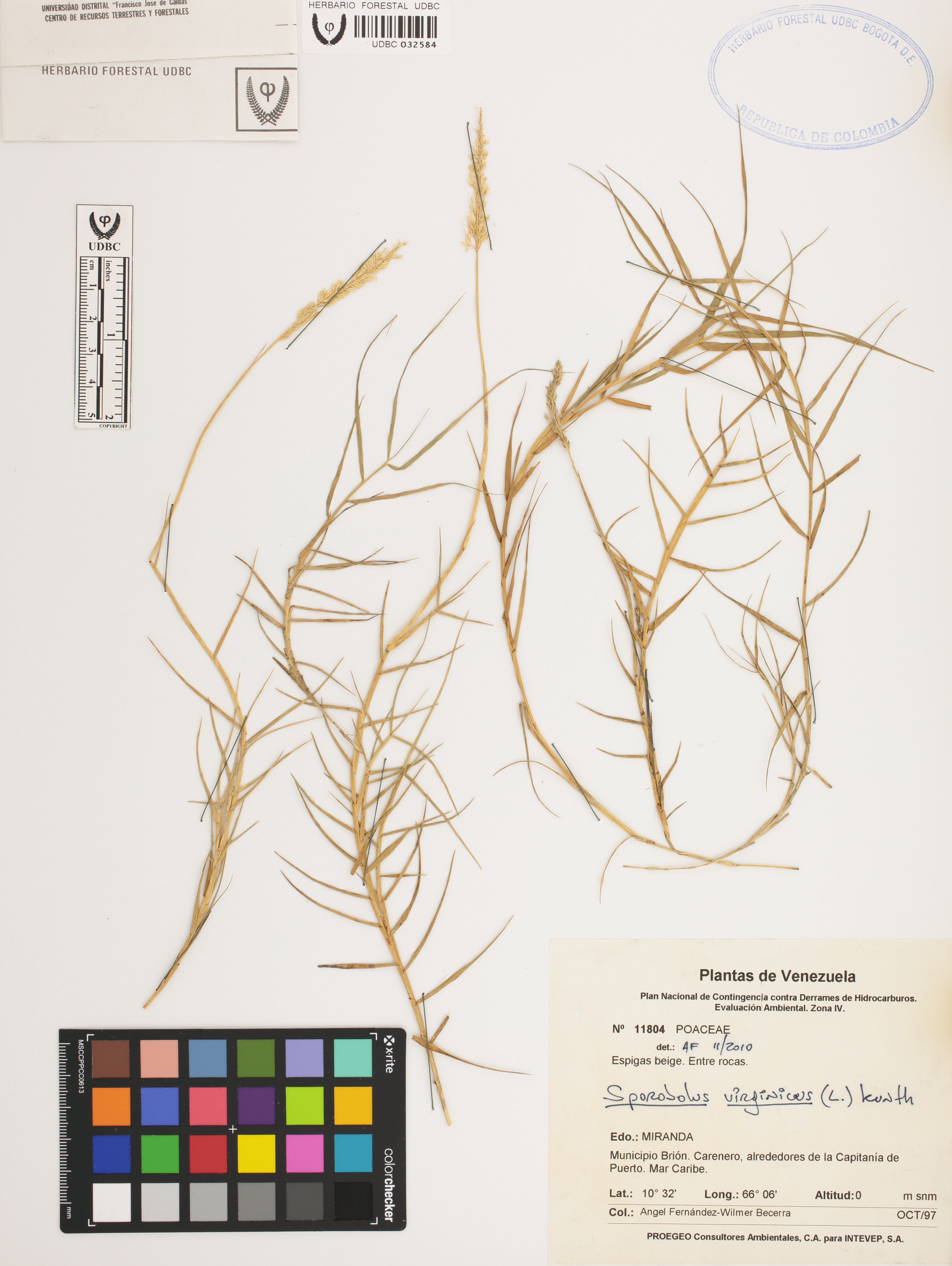 Fotografía del ejemplar Fernández, A. 11804, determinado como Sporobolus virginicus en el año 2010