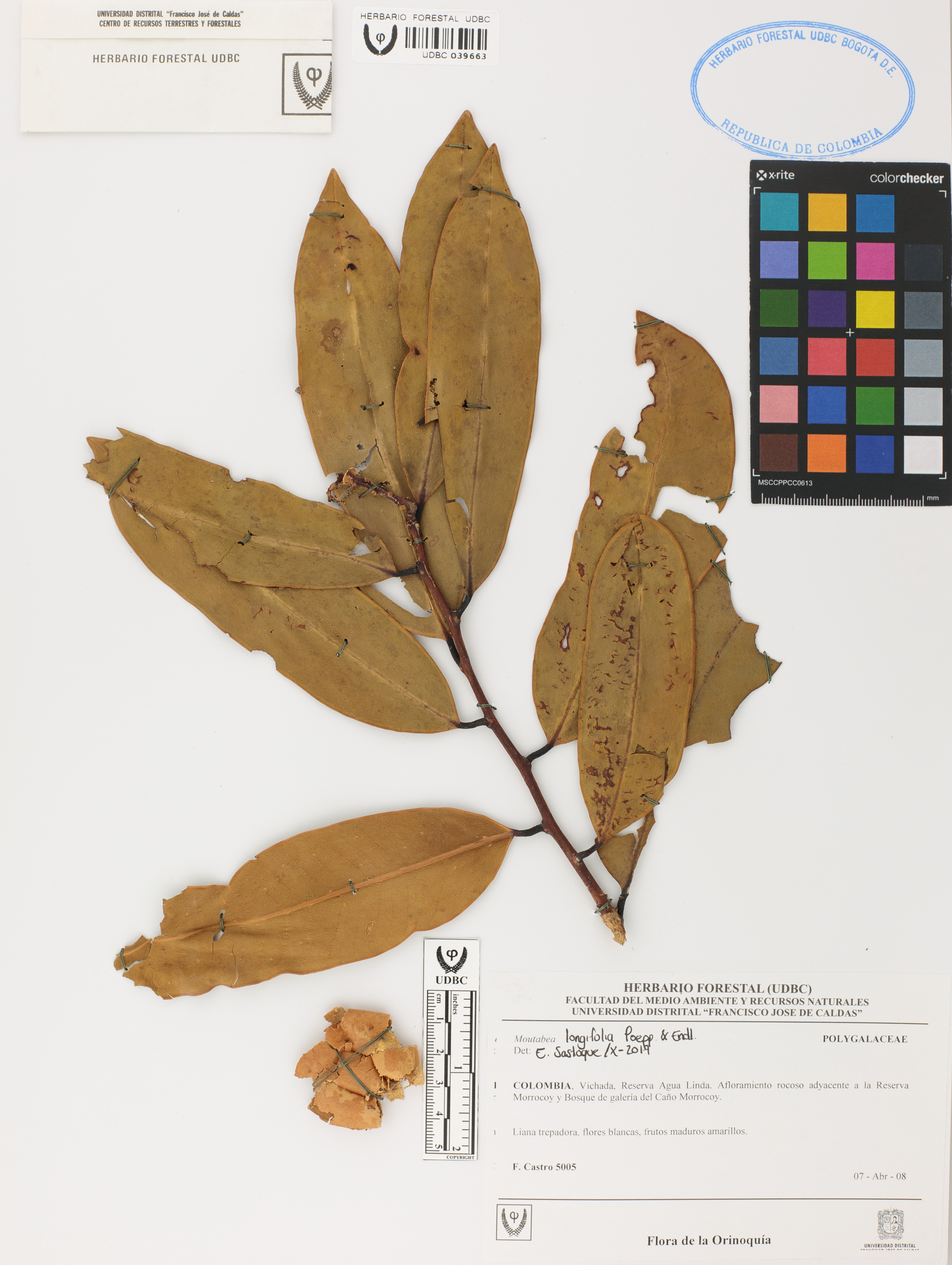 Fotografía del ejemplar Castro, F. 5005, determinado como Moutabea longifolia en el año 2017