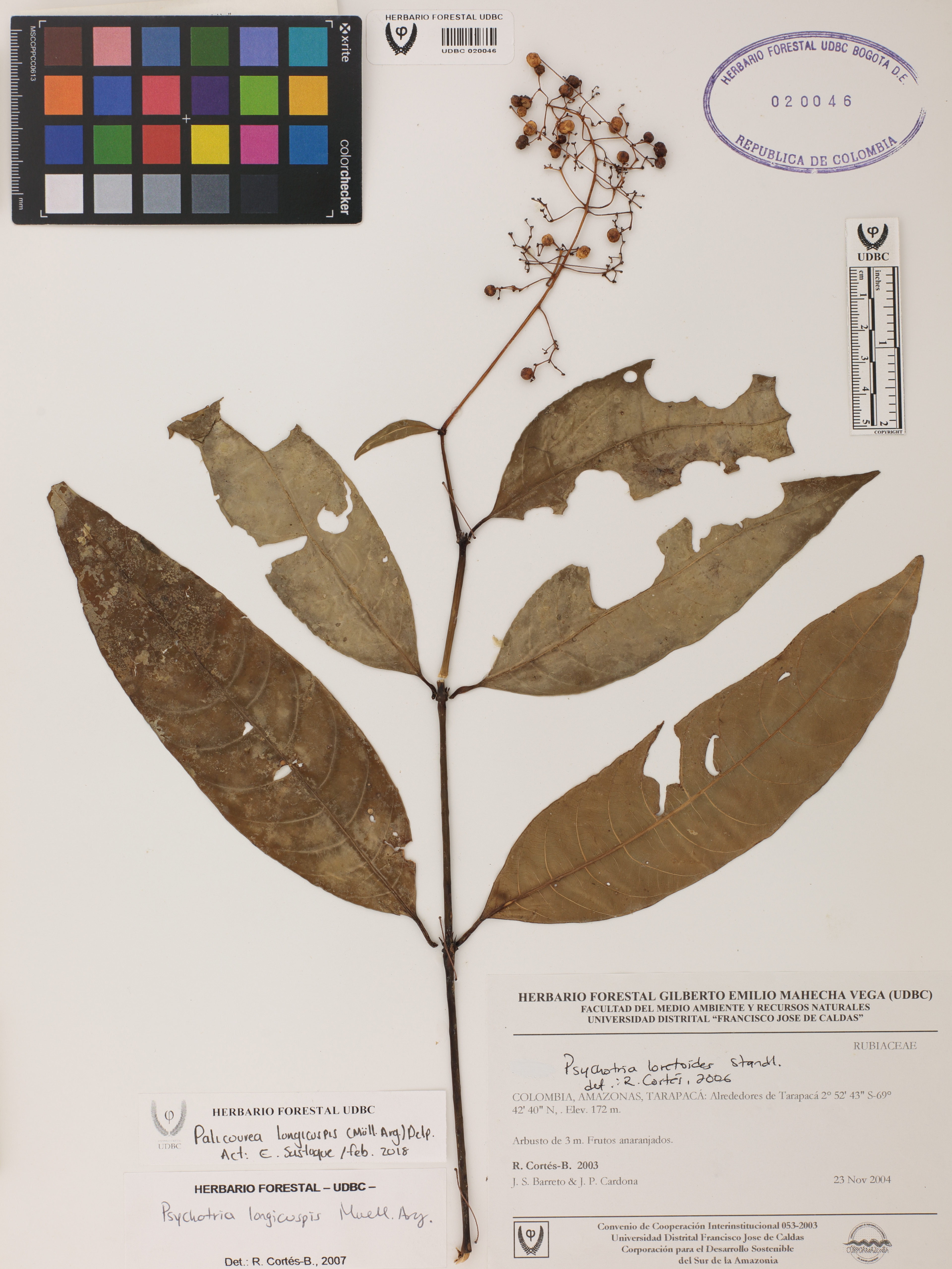 Fotografía del ejemplar Cortés-B., R. 2003, determinado como Palicourea longicuspis en el año 2007