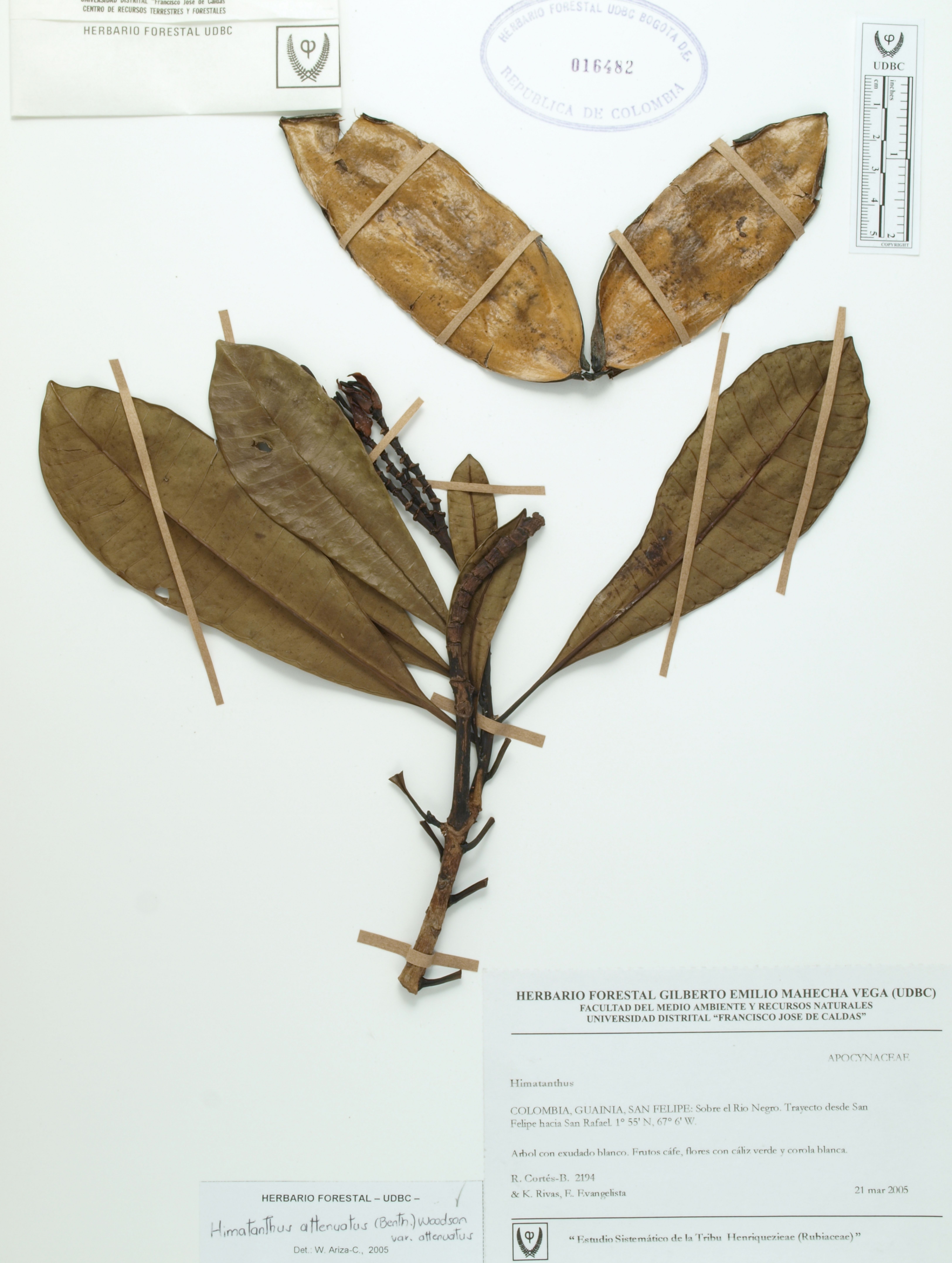 Fotografía del ejemplar Cortés-B., R. 2194, determinado como Himatanthus attenuatus en el año 2005