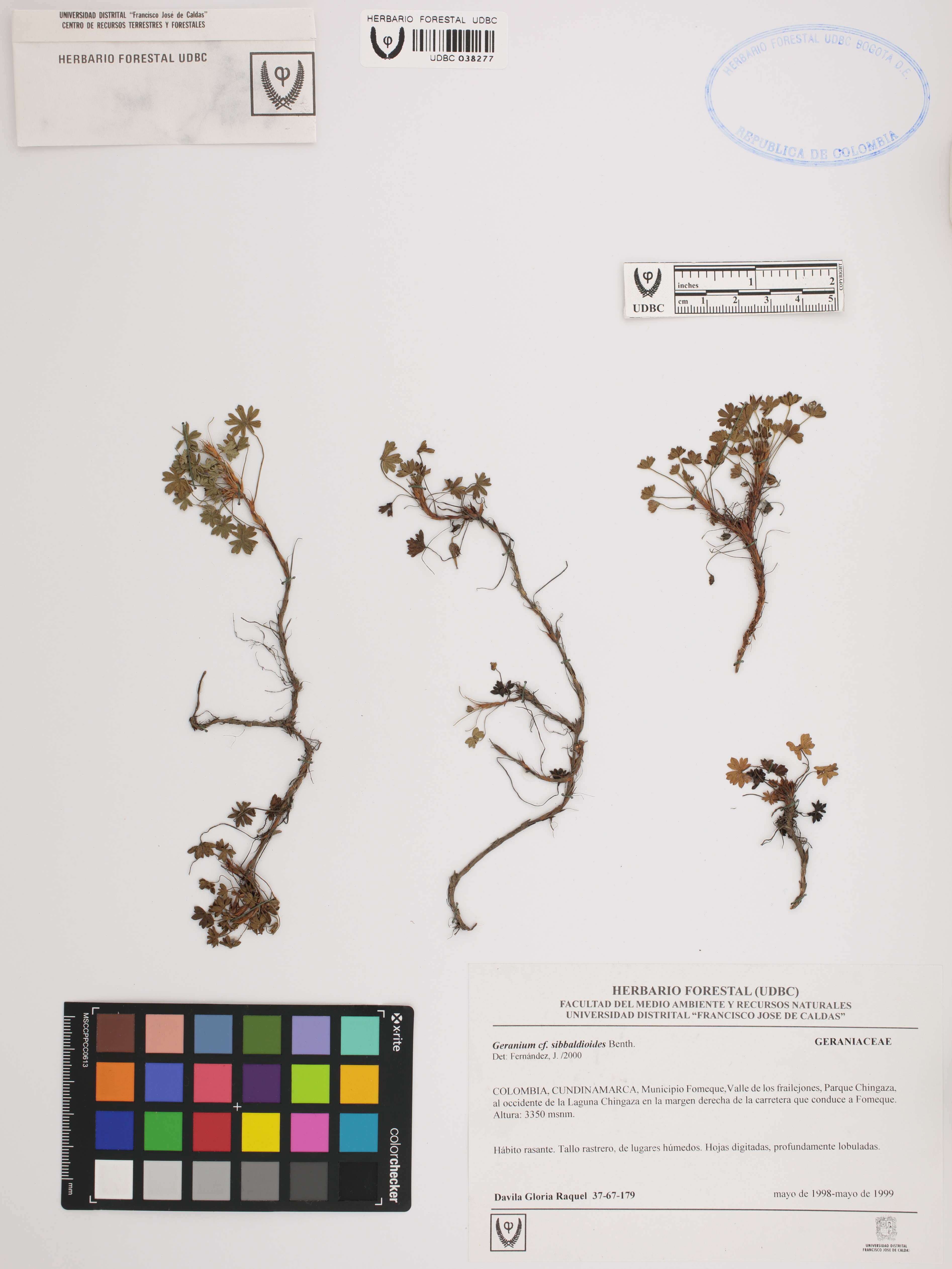 Fotografía del ejemplar Dávila, G. 37, determinado como Geranium sibbaldioides en el año 2000