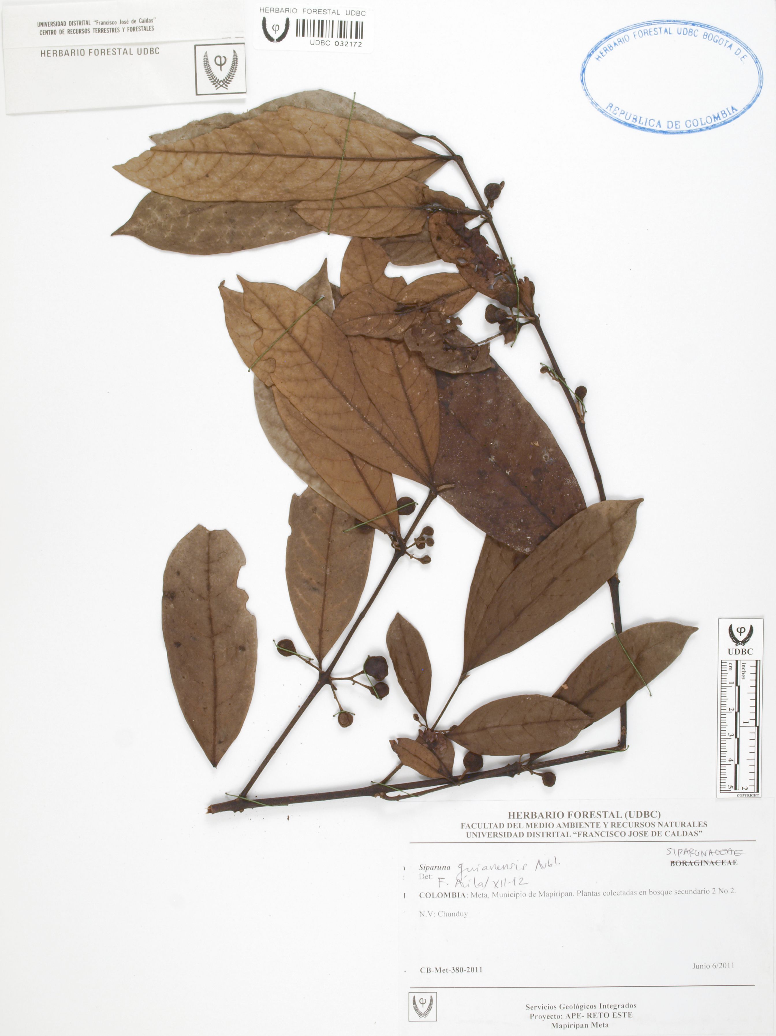 | dc.description | Fotografía del ejemplar SD 380, determinado como Siparuna guianensis en el año 2012 | |