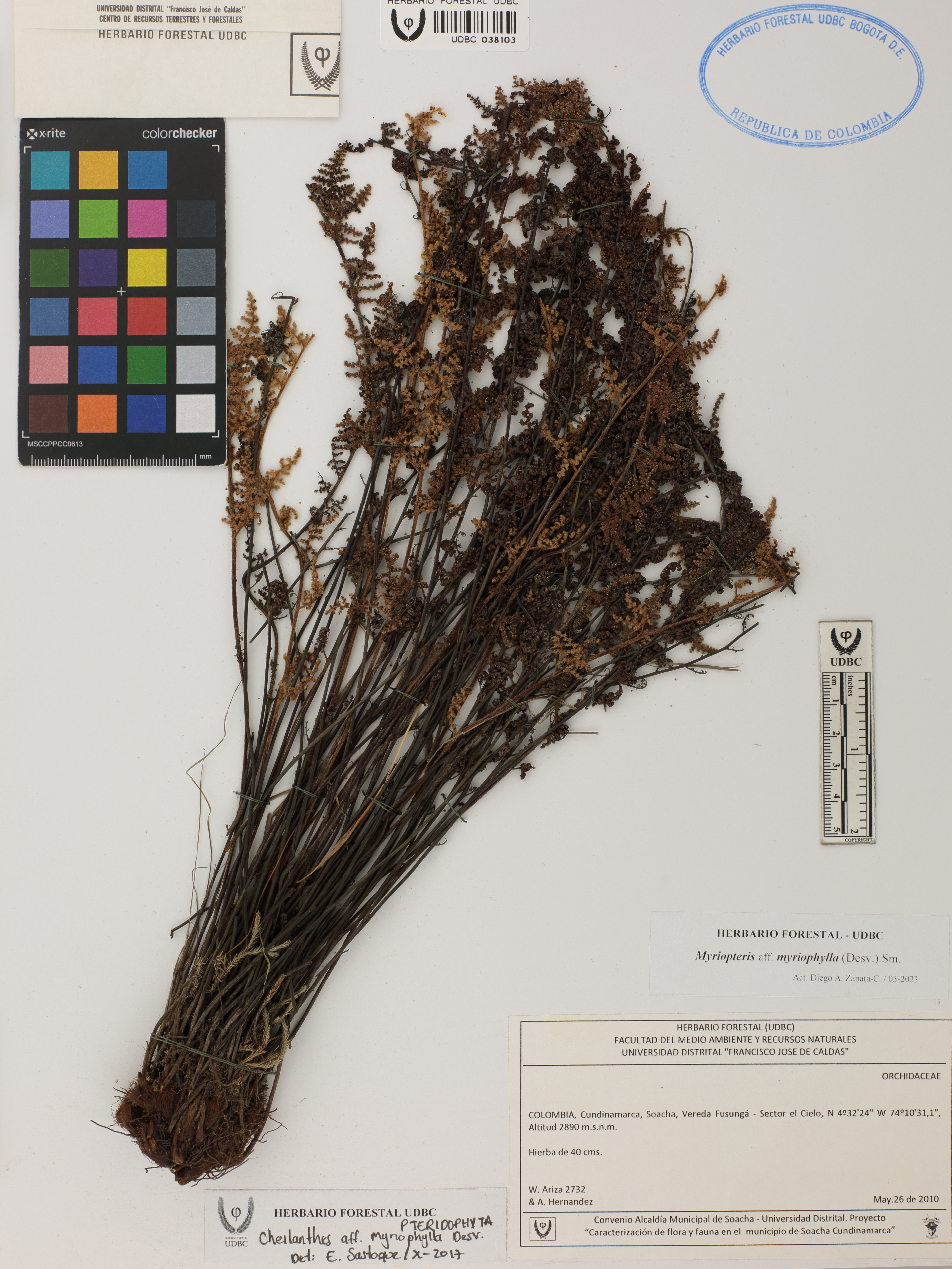 Fotografía del ejemplar Ariza, W. 2732, determinado como Myriopteris myriophylla en el año 2017
