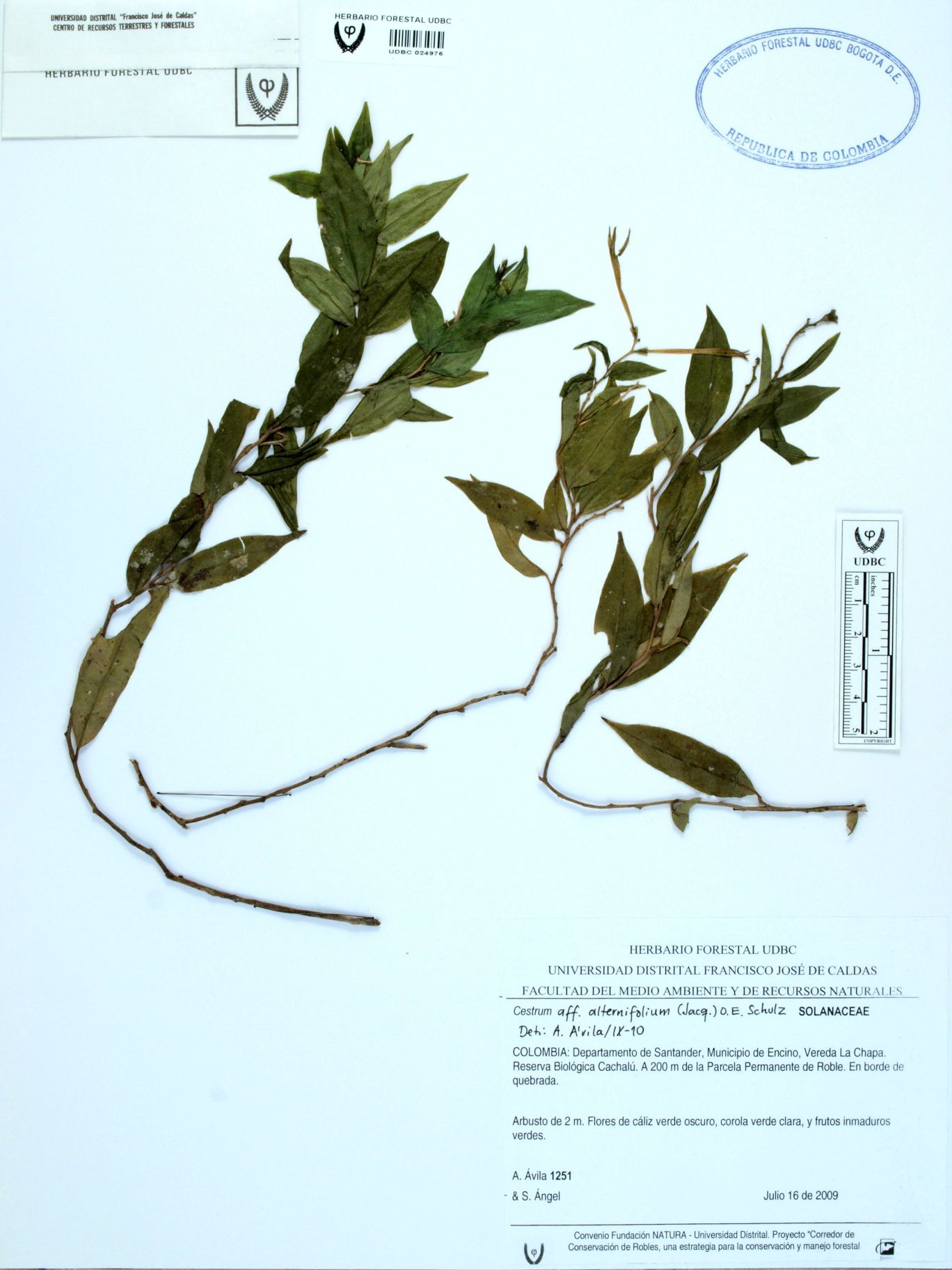Fotografía del ejemplar Ávila, F. 1251, determinado como Cestrum alternifolium en el año 2010