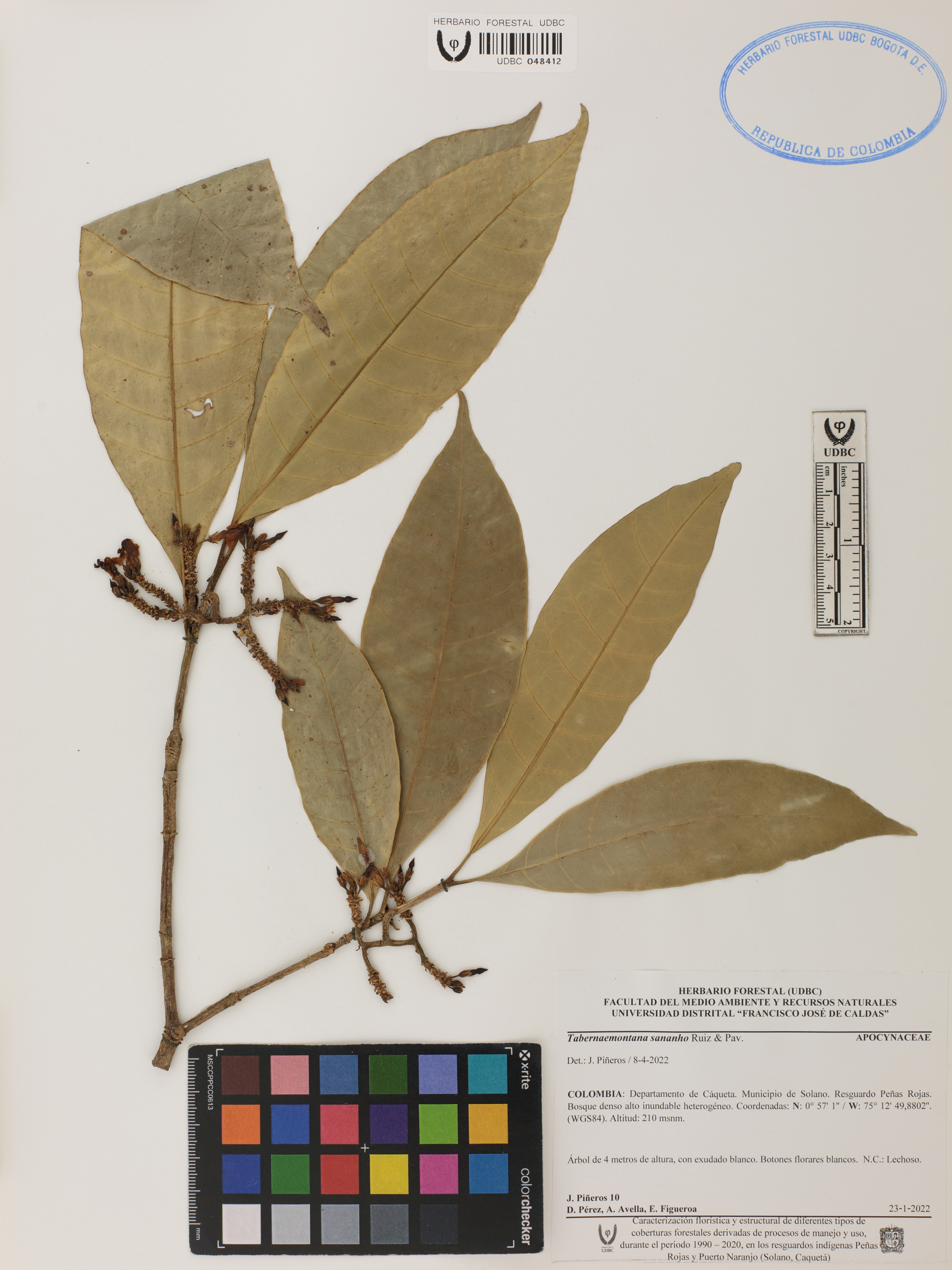Fotografía del ejemplar Piñeros, J. 10, determinado como Tabernaemontana sananho en el año 2022