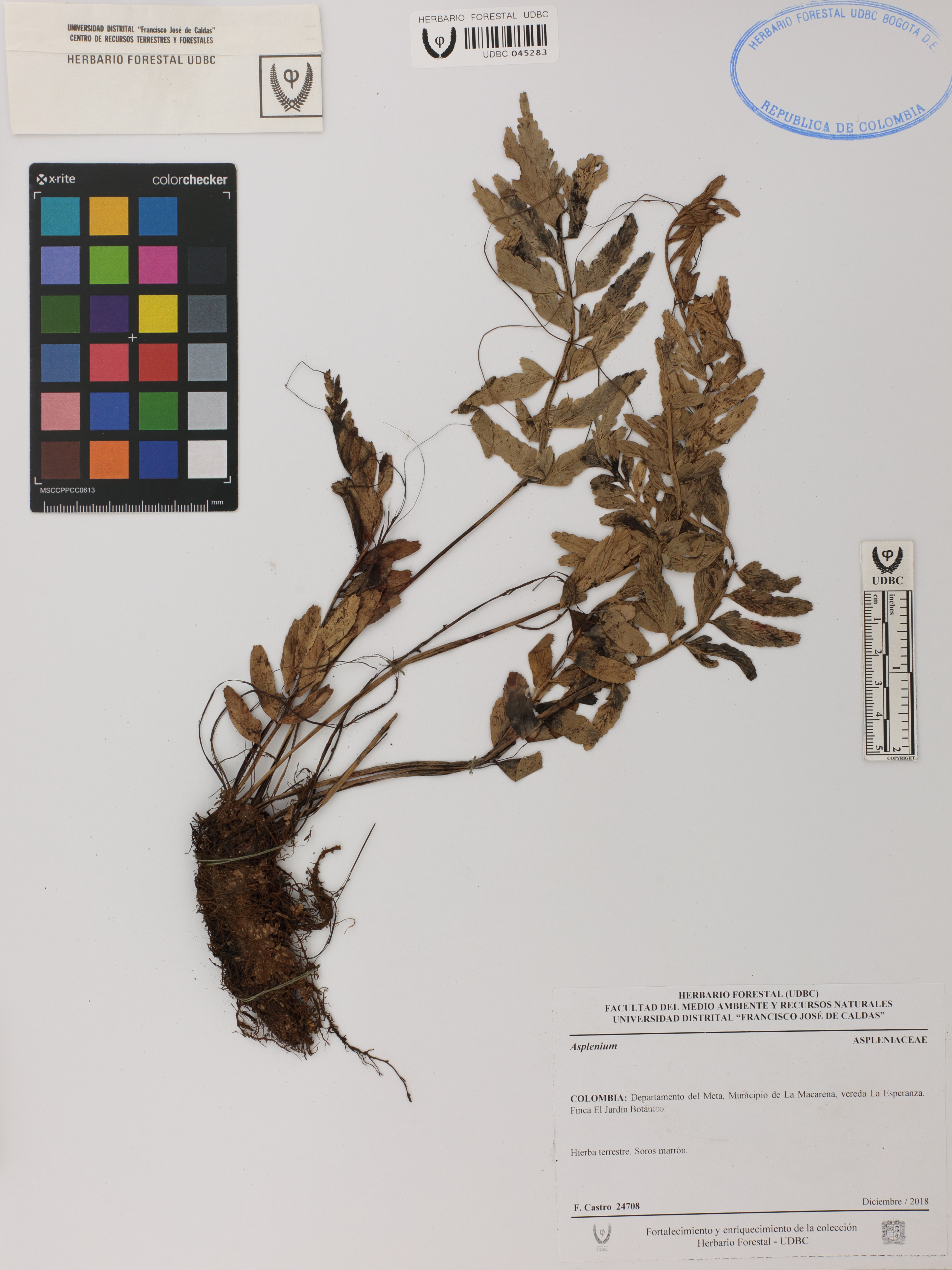 Fotografía del ejemplar Castro, F. 24708, determinado como Asplenium sp.