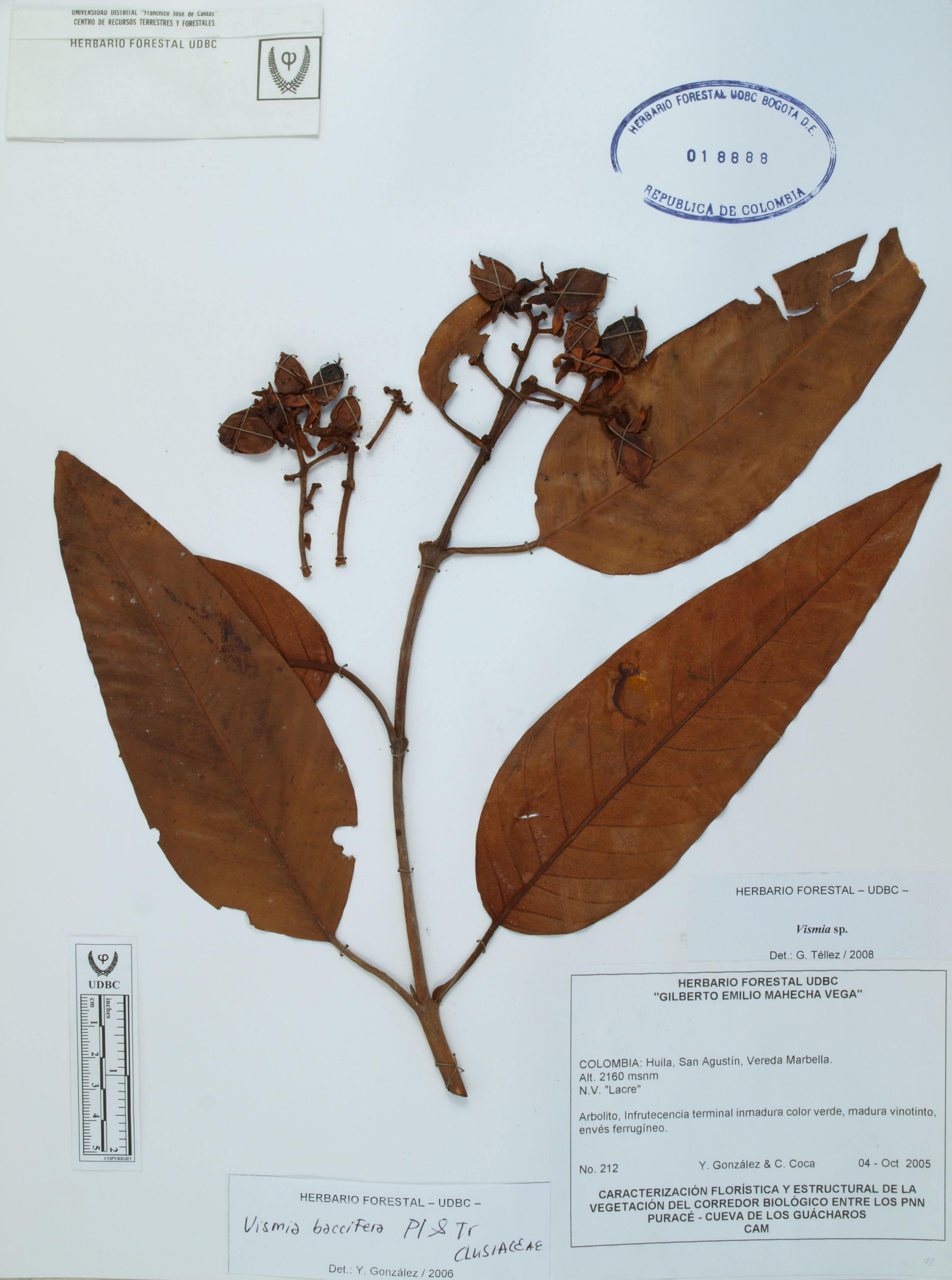 Fotografía del ejemplar González, Y. 212, determinado como Vismia sp. en el año 2008