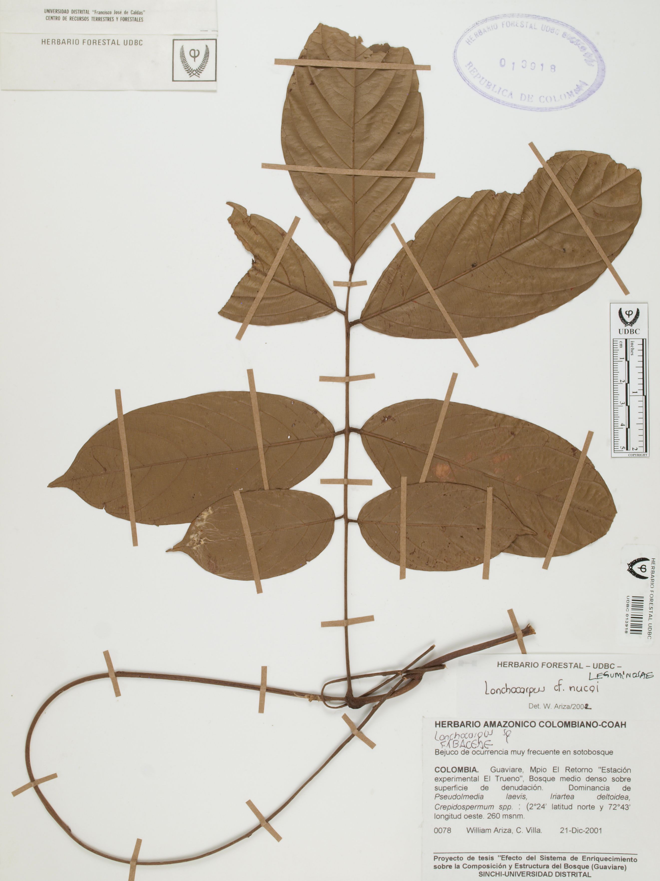 Fotografía del ejemplar Ariza, W. 78, determinado como Lonchocarpus nicou en el año 2002