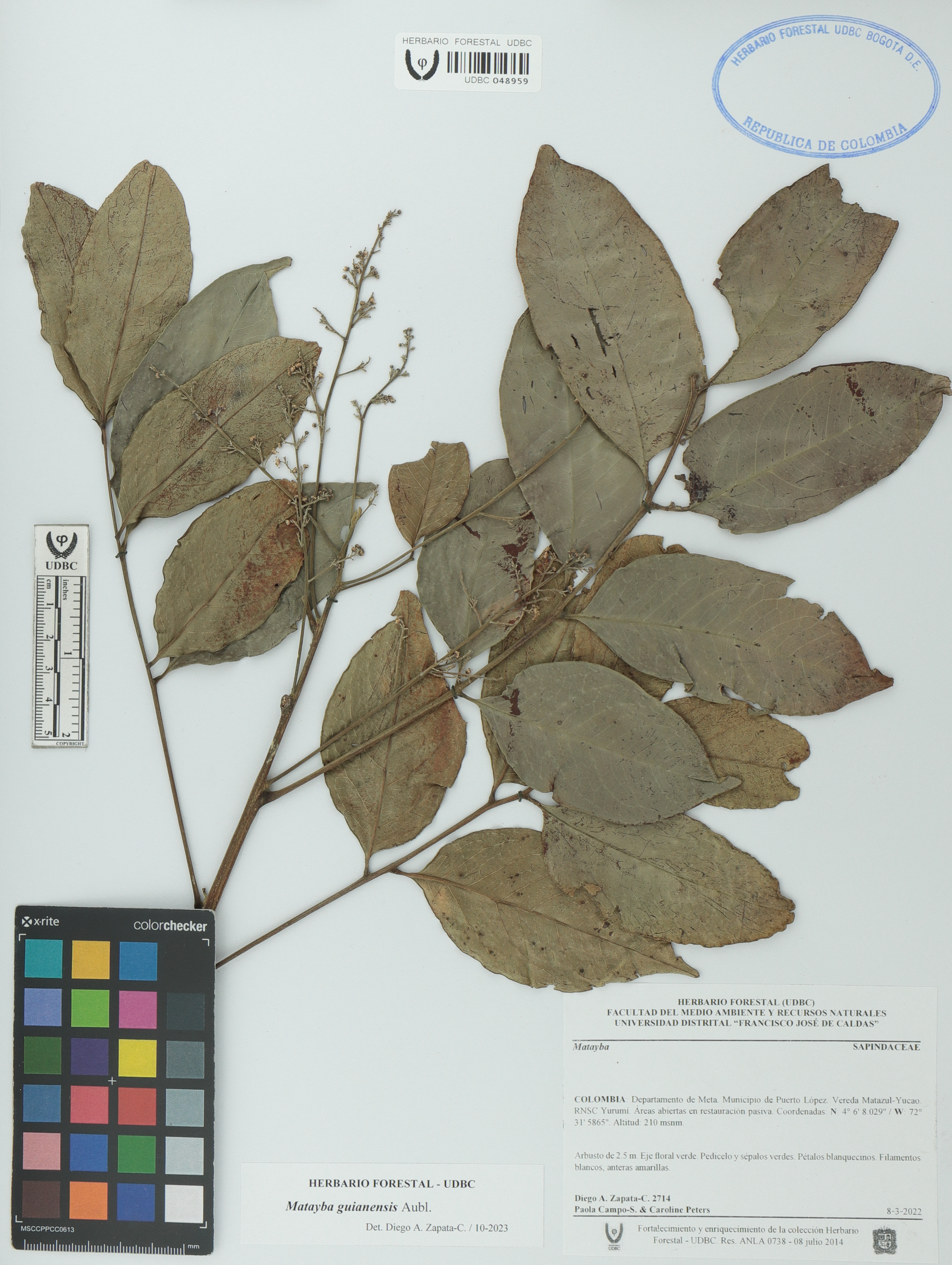 Fotografía del ejemplar Zapata-C., D. 2714, determinado como Matayba guianensis en el año 2023