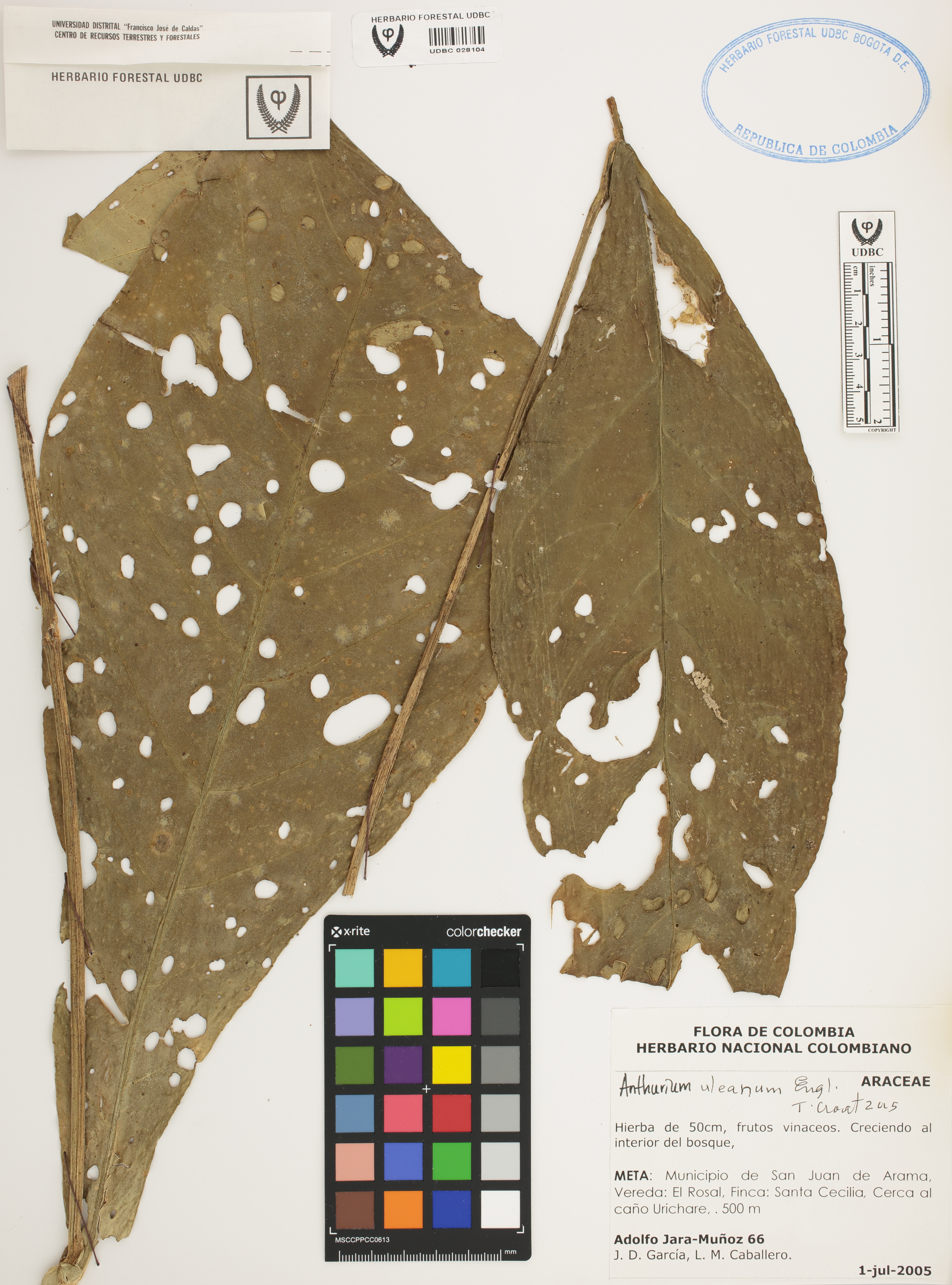 Fotografía del ejemplar Jara-Muñoz, A. 66, determinado como Anthurium uleanum en el año 2015