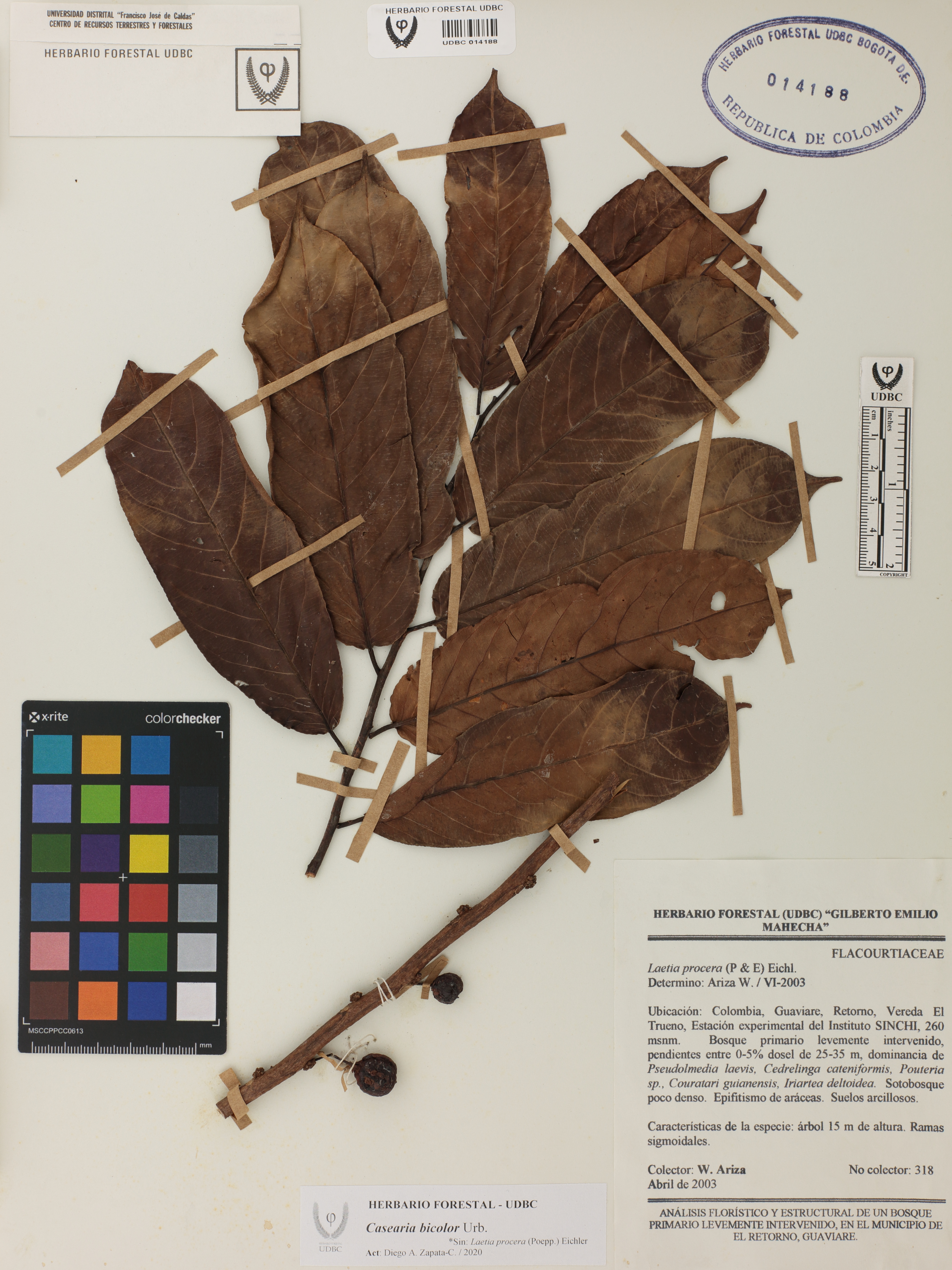Fotografía del ejemplar Ariza, W. 318, determinado como Casearia bicolor en el año 2003
