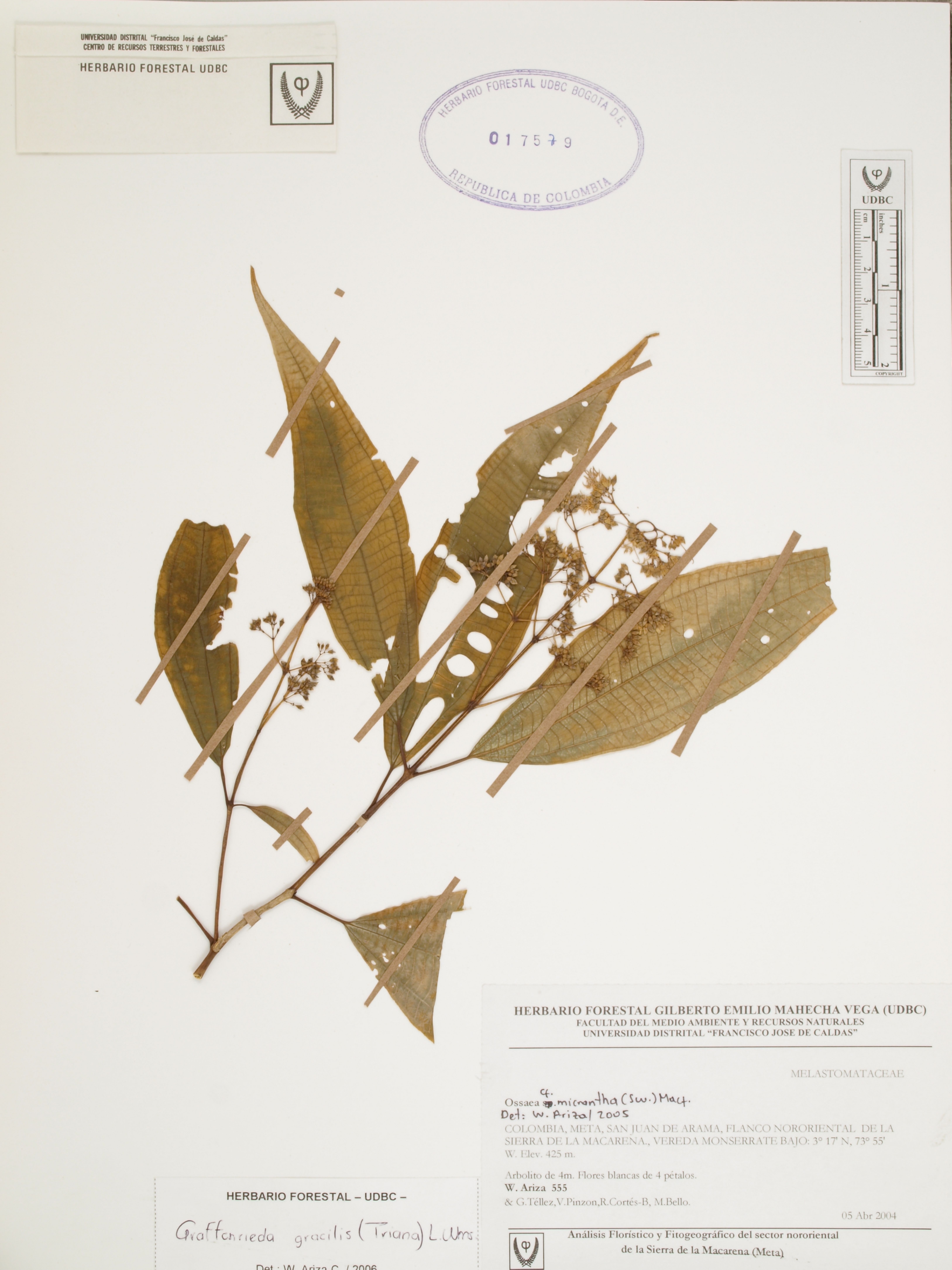 Fotografía del ejemplar Ariza, W. 555, determinado como Graffenrieda gracilis en el año 2006