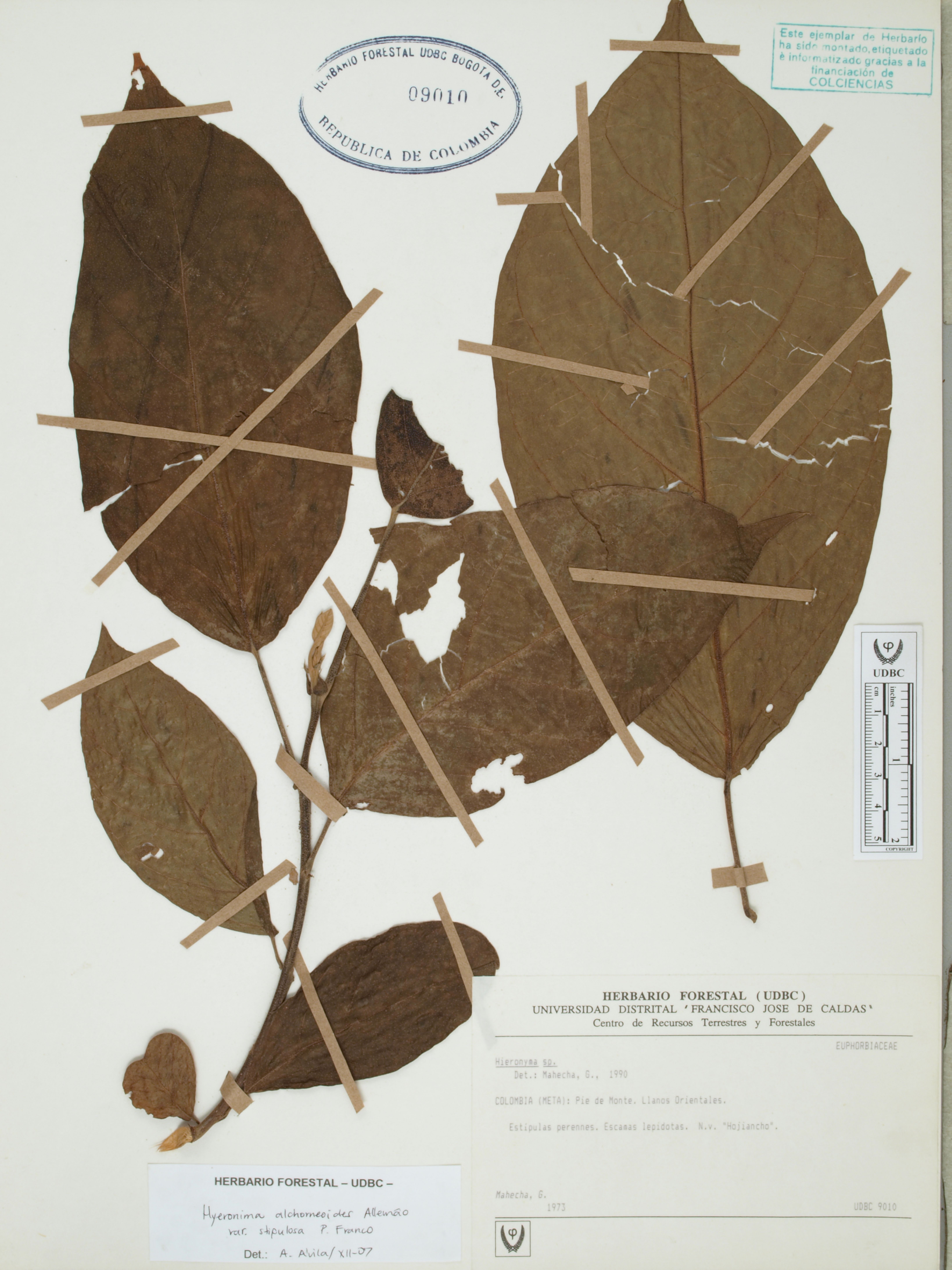 Fotografía del ejemplar Mahecha, G., determinado como Hieronyma alchorneoides var. stipulosa en el año 2007