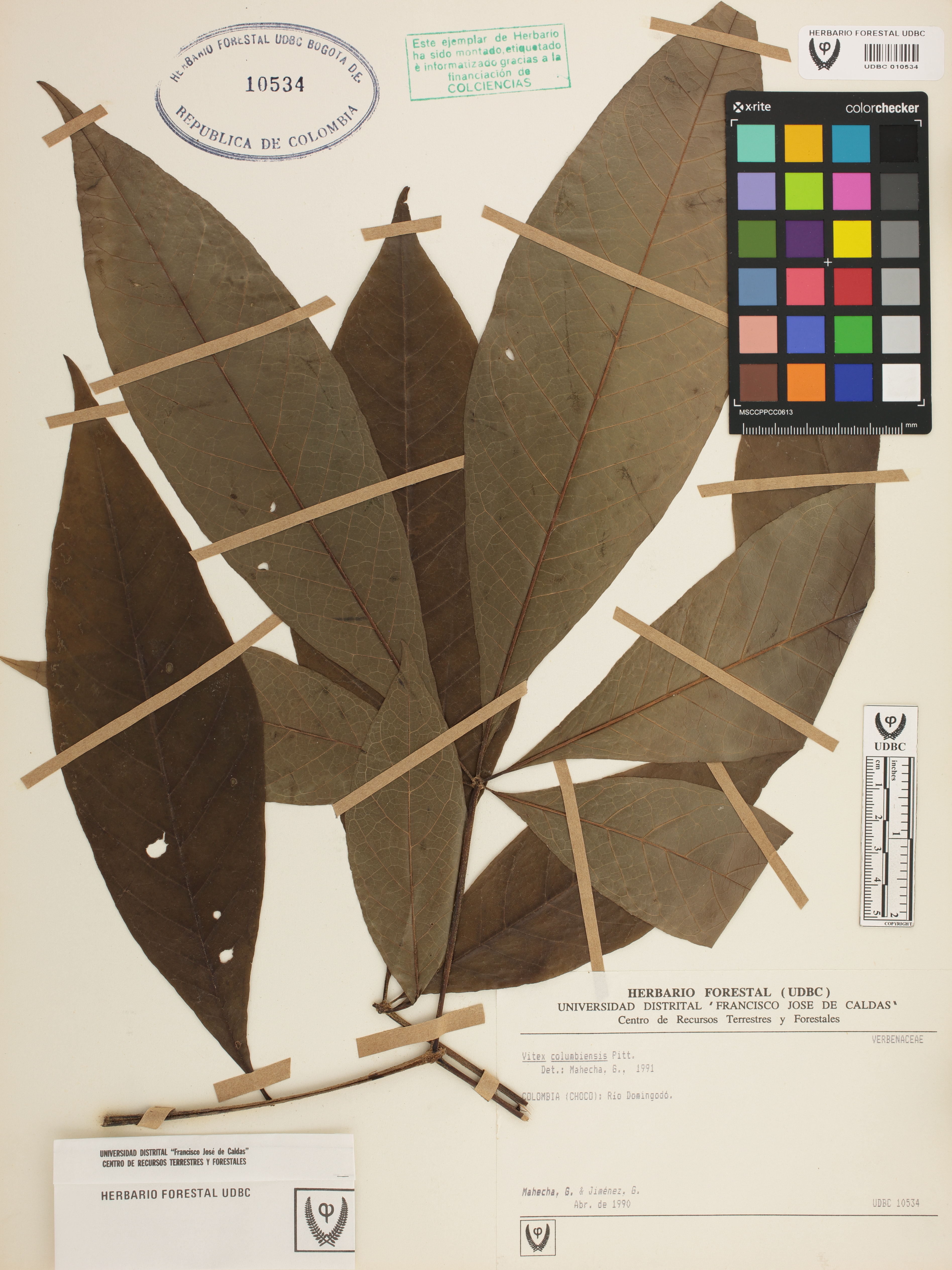 Fotografía del ejemplar Mahecha, G., determinado como Vitex columbiensis en el año 1991