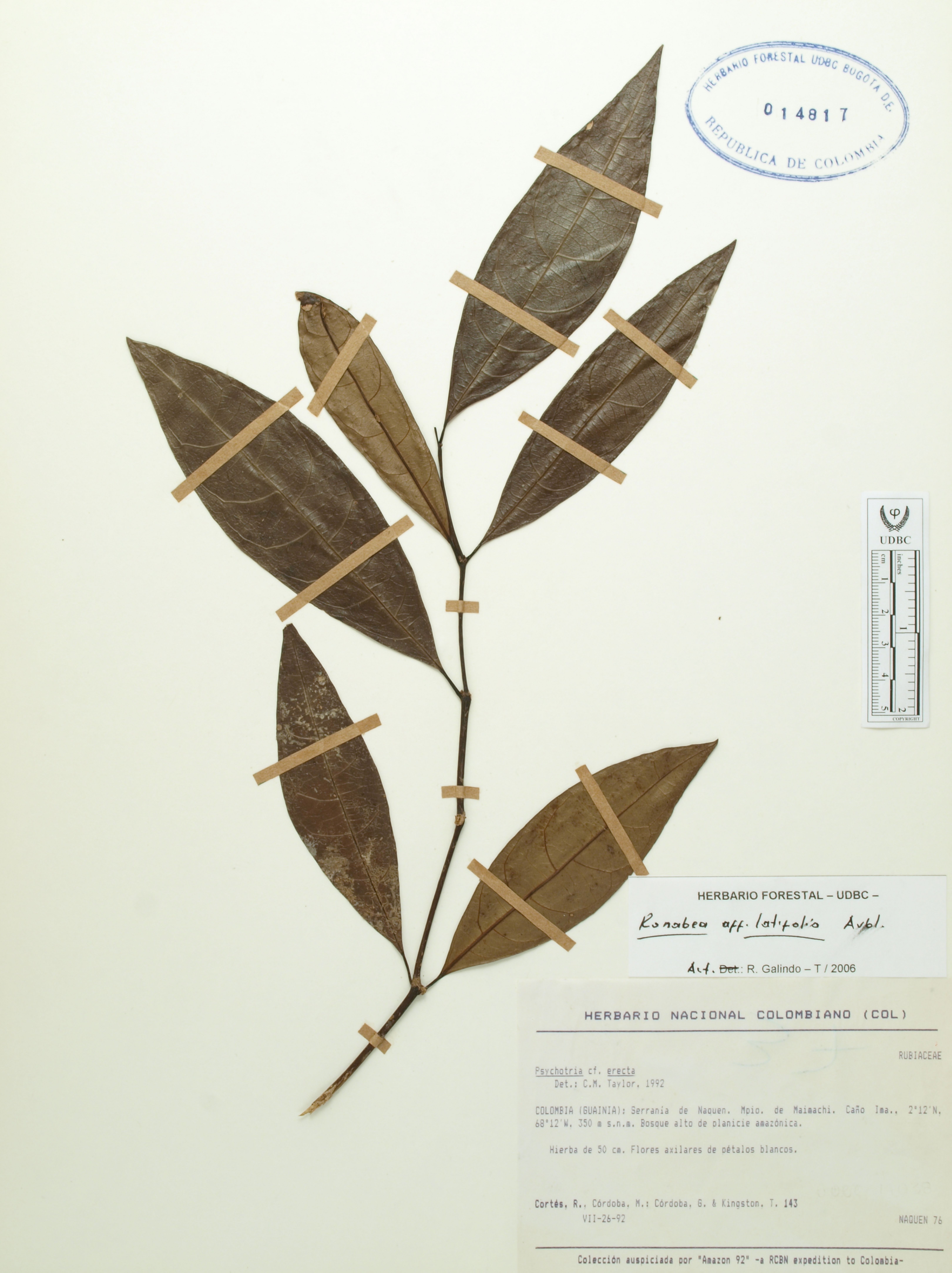 Fotografía del ejemplar Cortés-B., R. 143, determinado como Ronabea latifolia en el año 2006
