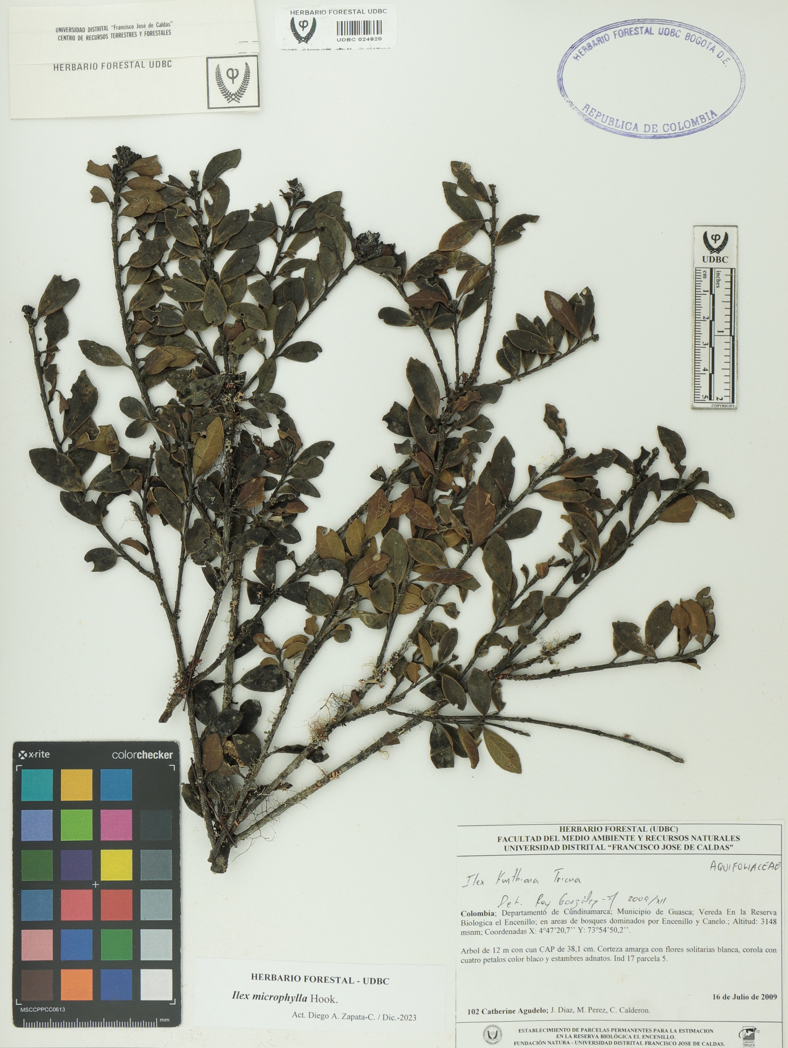Fotografía del ejemplar Agudelo, C. 102, determinado como Ilex microphylla en el año 2009