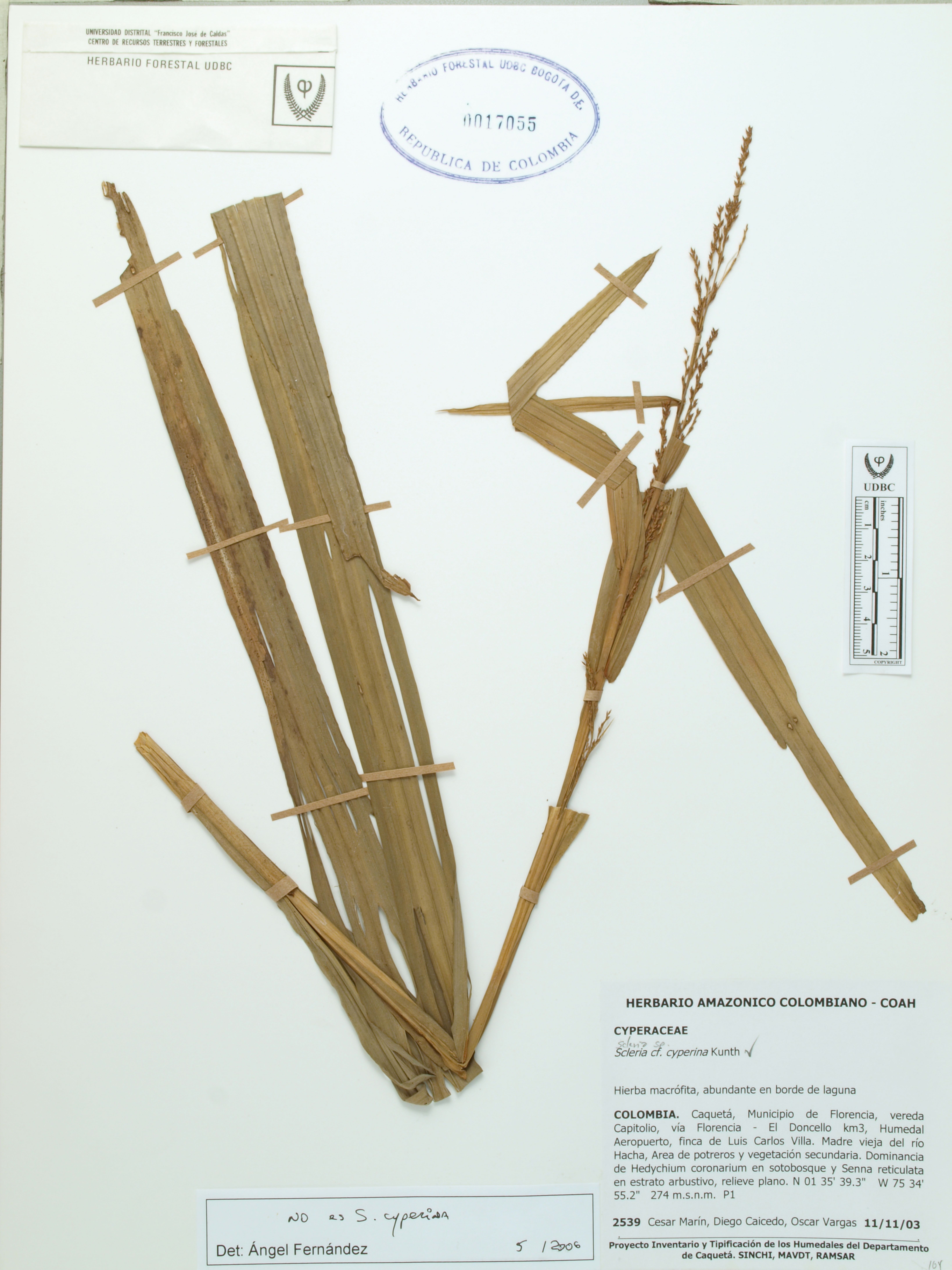 Fotografía del ejemplar Marín, C. 2539, determinado como Scleria microcarpa en el año 2011