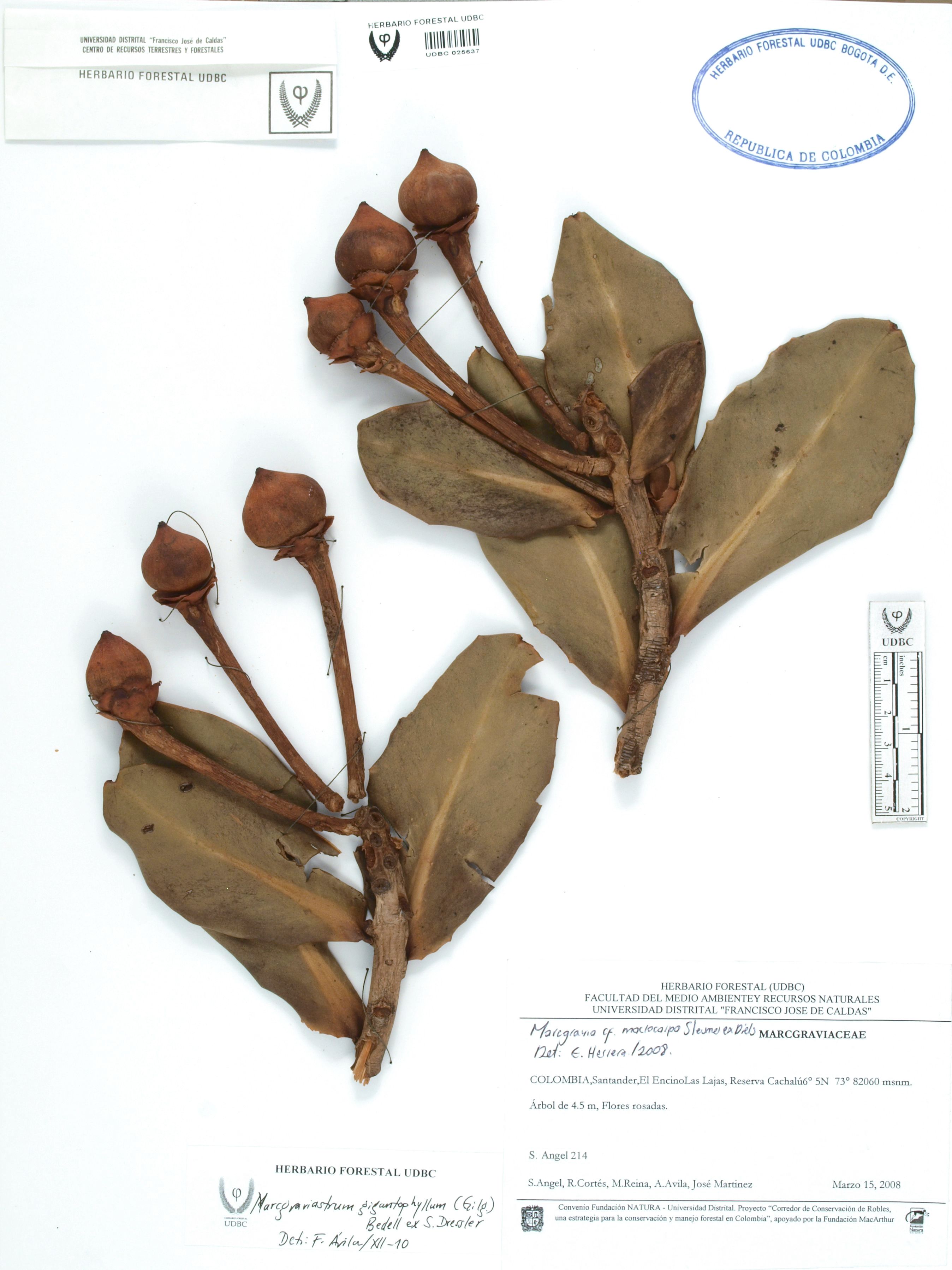 Fotografía del ejemplar Ángel, S. 214, determinado como Marcgraviastrum gigantophyllum en el año 2010