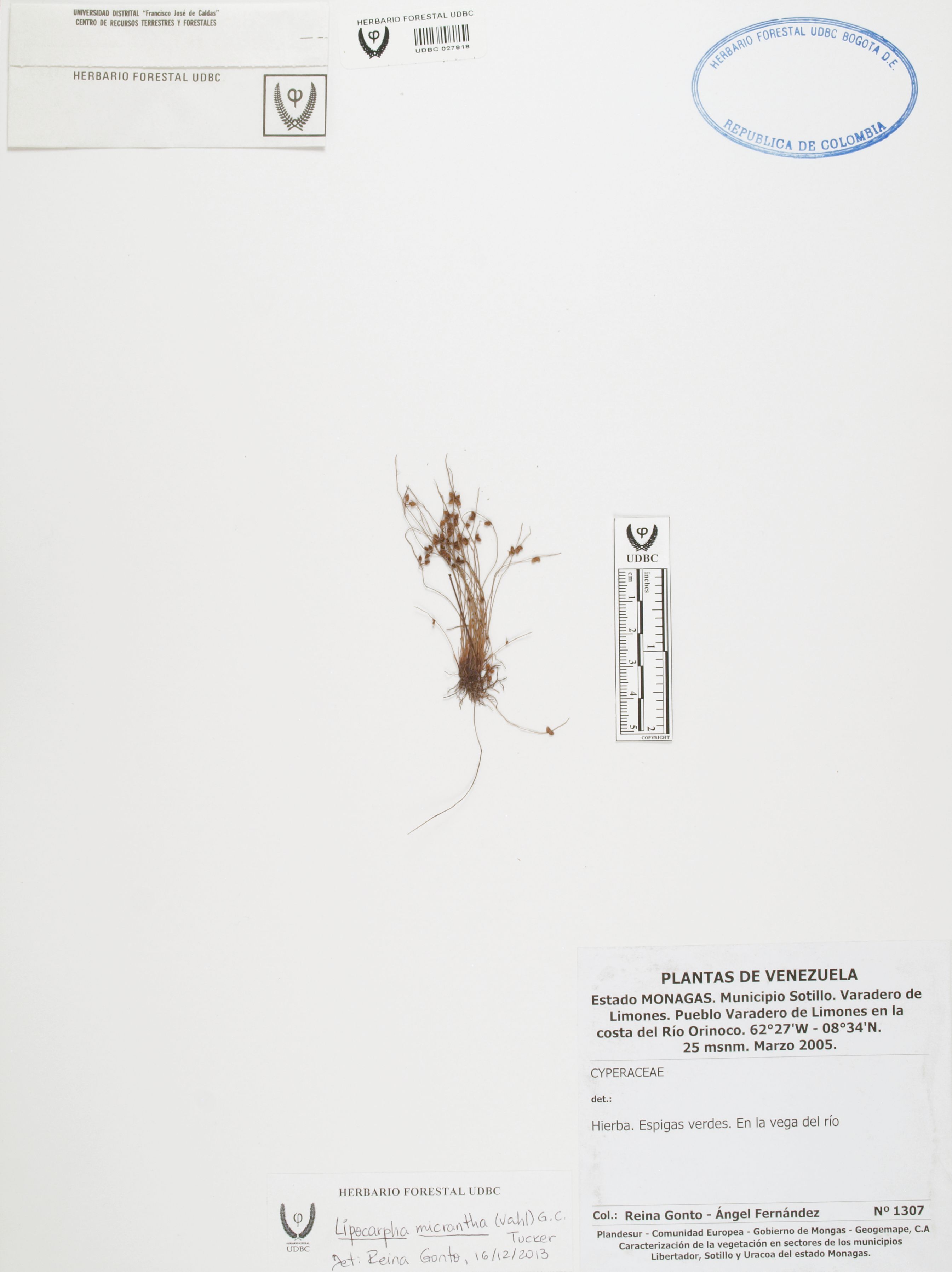 Fotografía del ejemplar Gonto, R. 1307, determinado como Lipocarpha micrantha en el año 2013