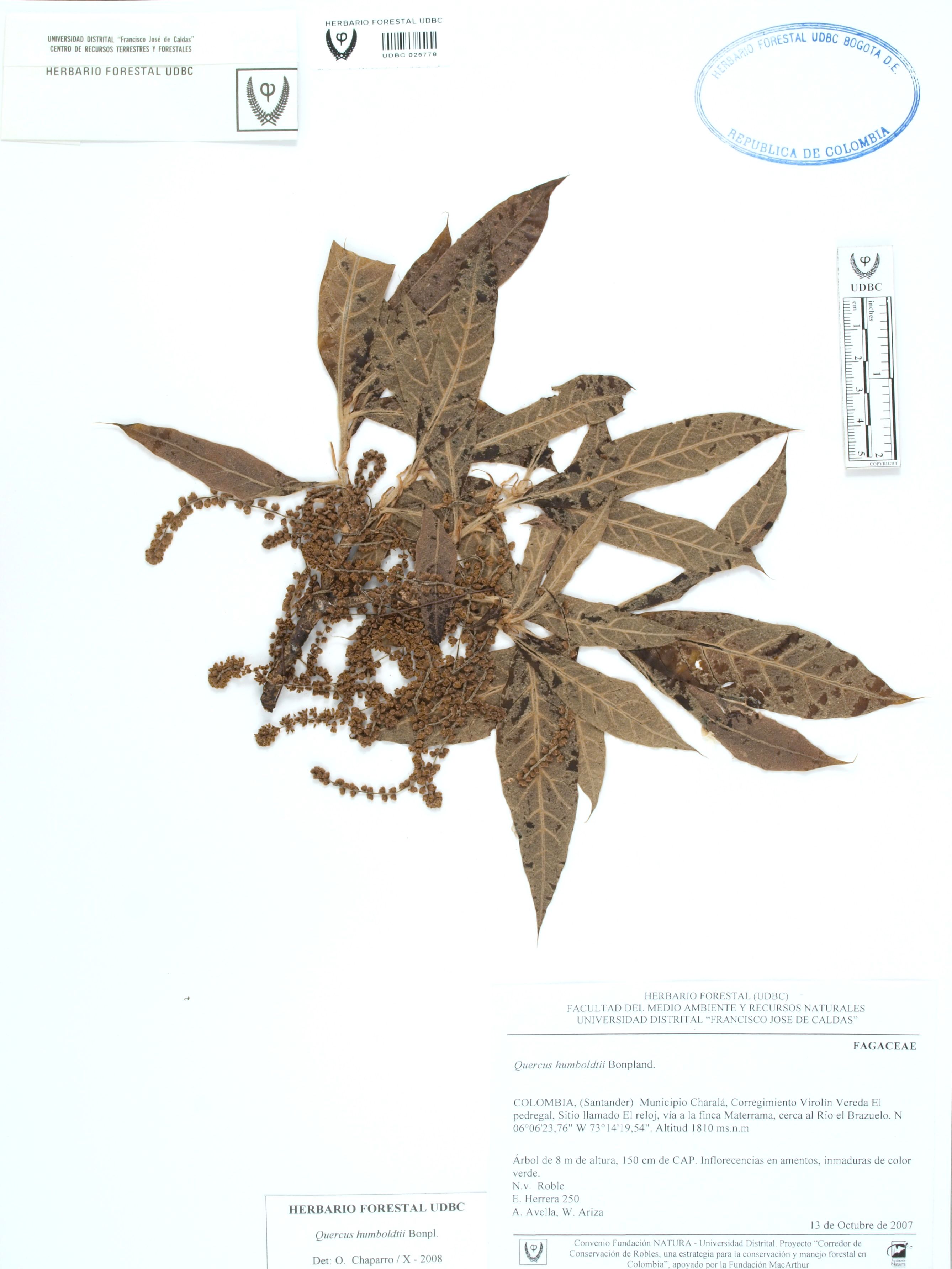 Fotografía del ejemplar Herrera, E. 250, determinado como Quercus humboldtii en el año 2008