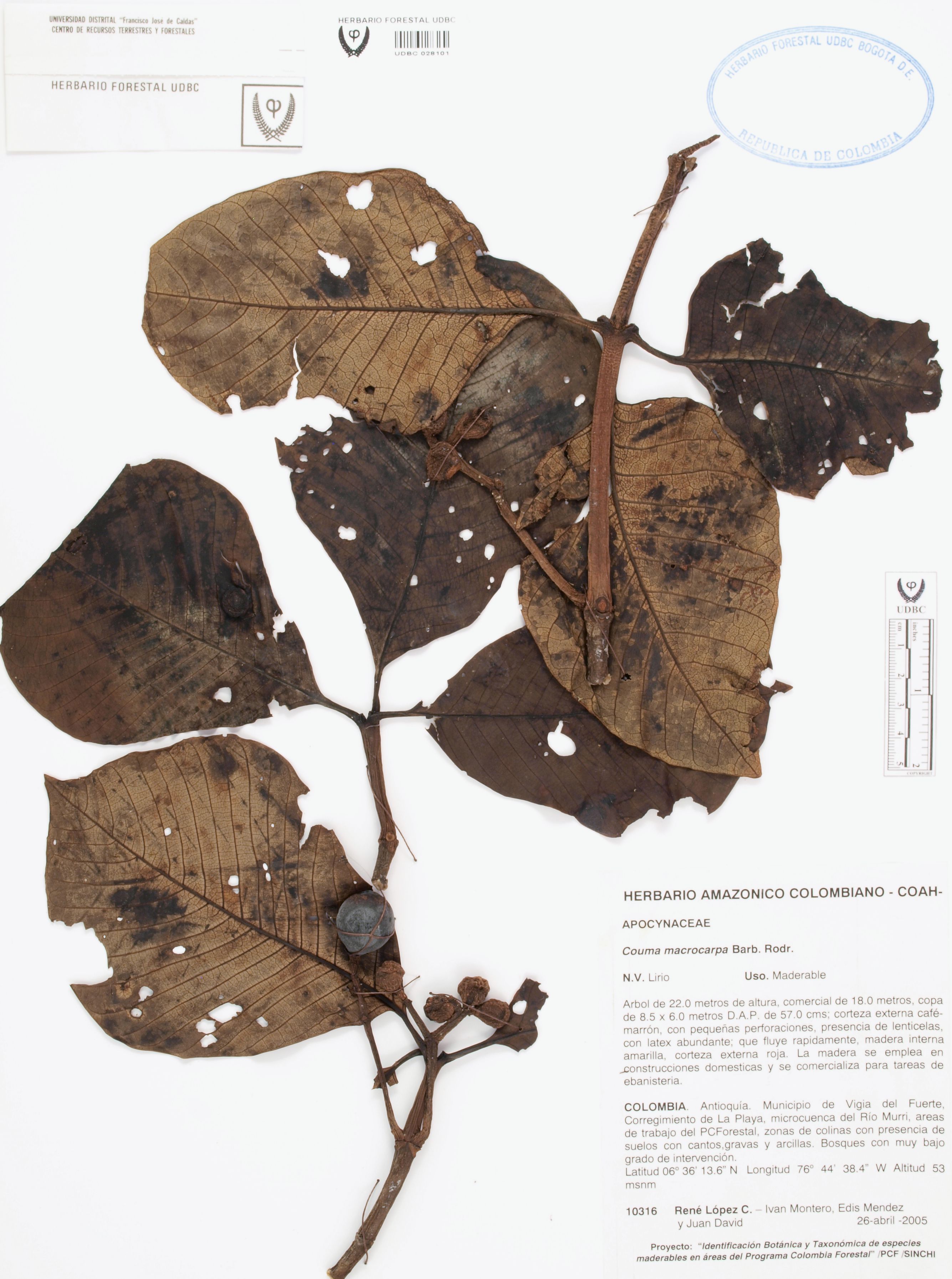 Fotografía del ejemplar López, R. 10316, determinado como Couma macrocarpa