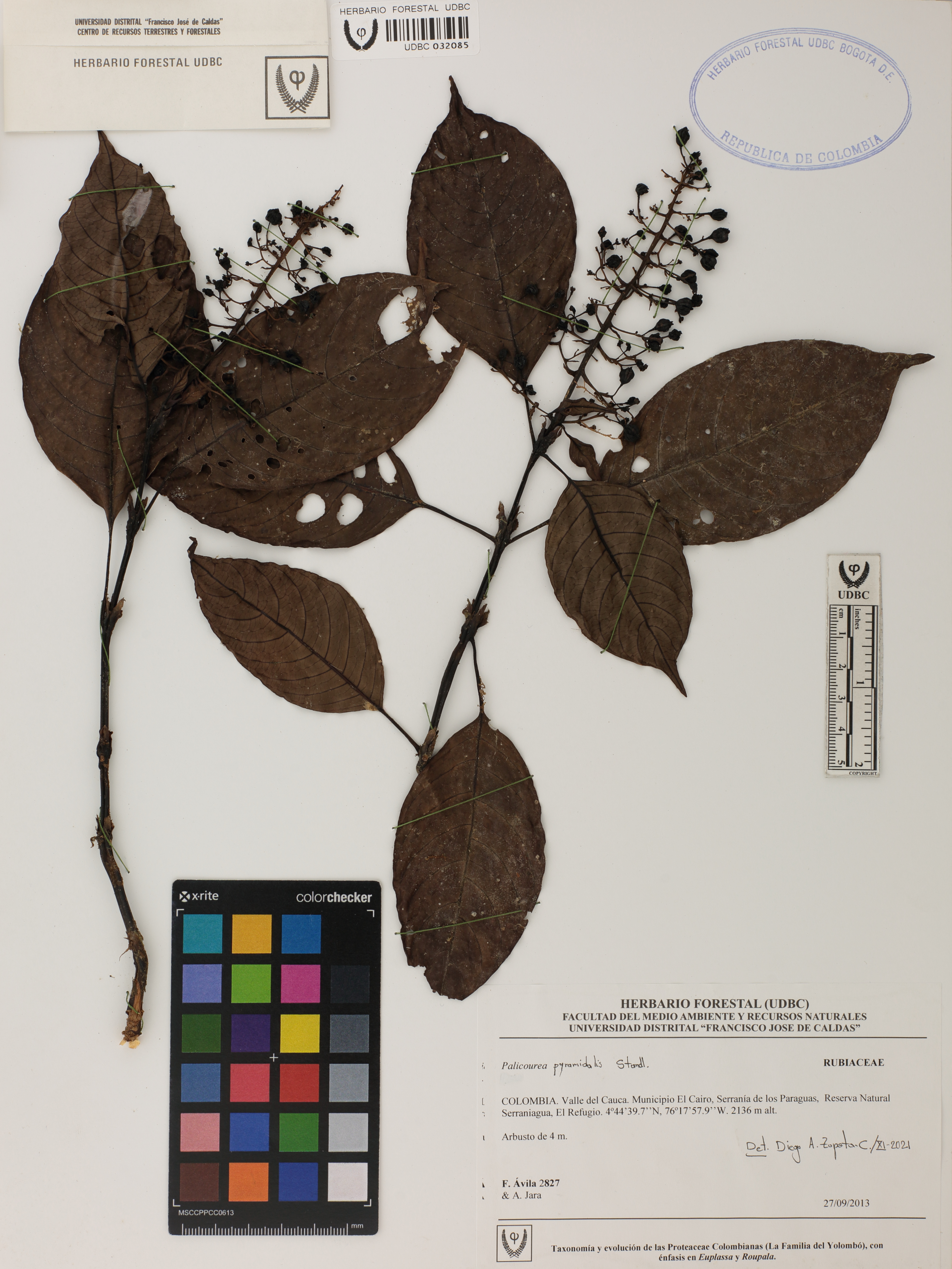 Fotografía del ejemplar Ávila, F. 2827, determinado como Palicourea pyramidalis en el año 2021