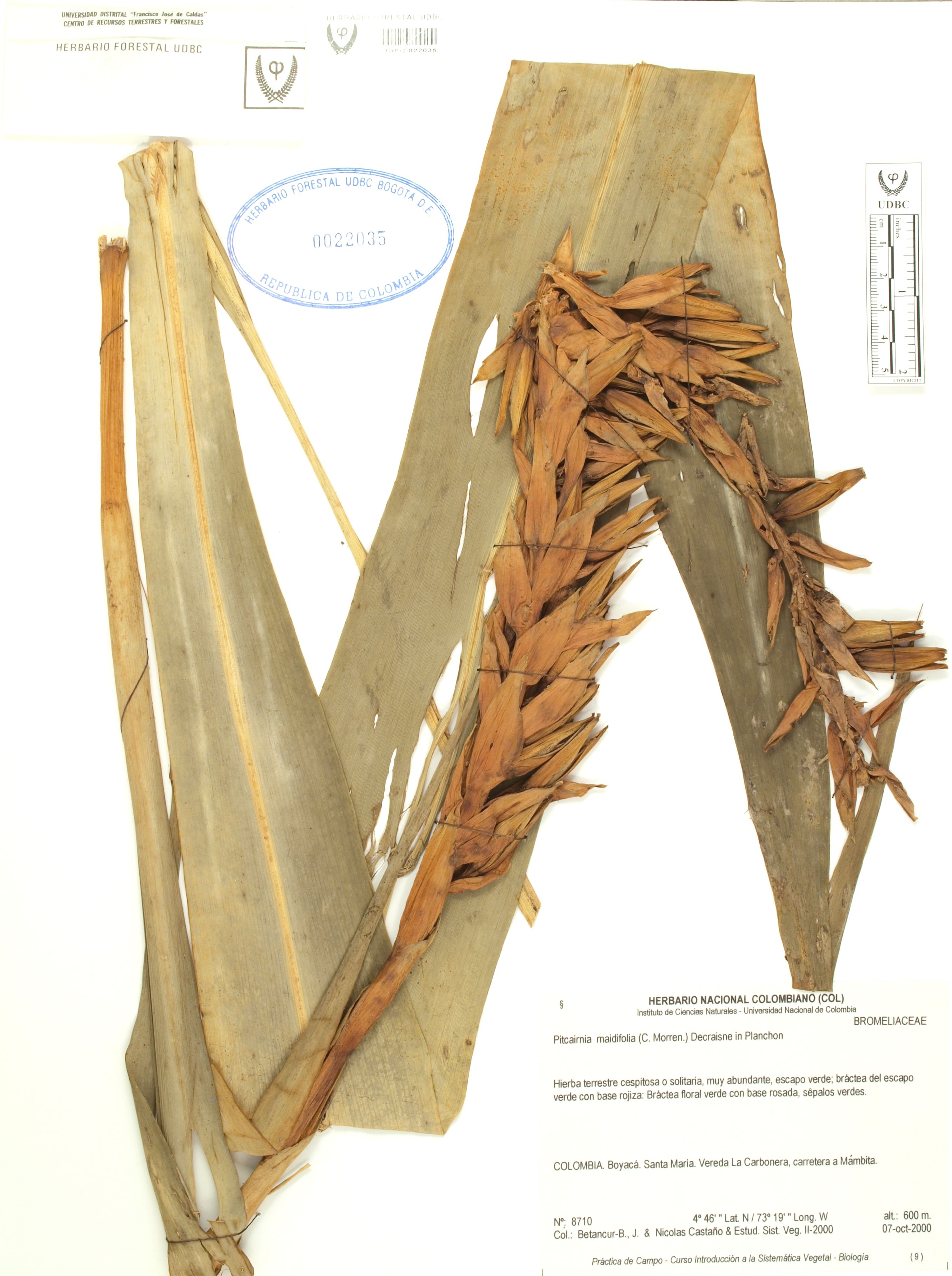 | dc.description | Fotografía del ejemplar Betancur, J. 8710, determinado como Pitcairnia maidifolia | |