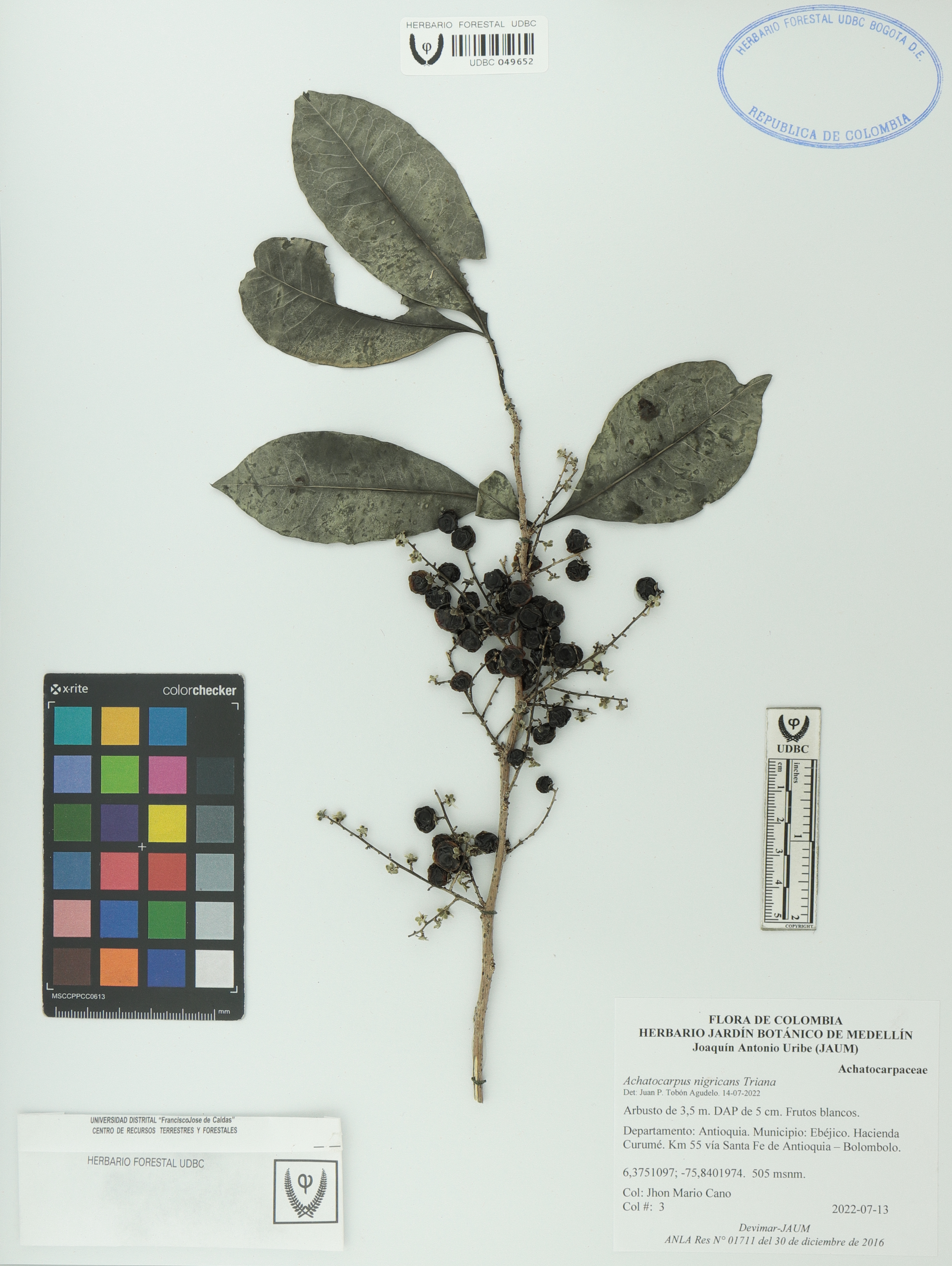 Fotografía del ejemplar Cano, J. 3, determinado como Achatocarpus nigricans en el año 2022
