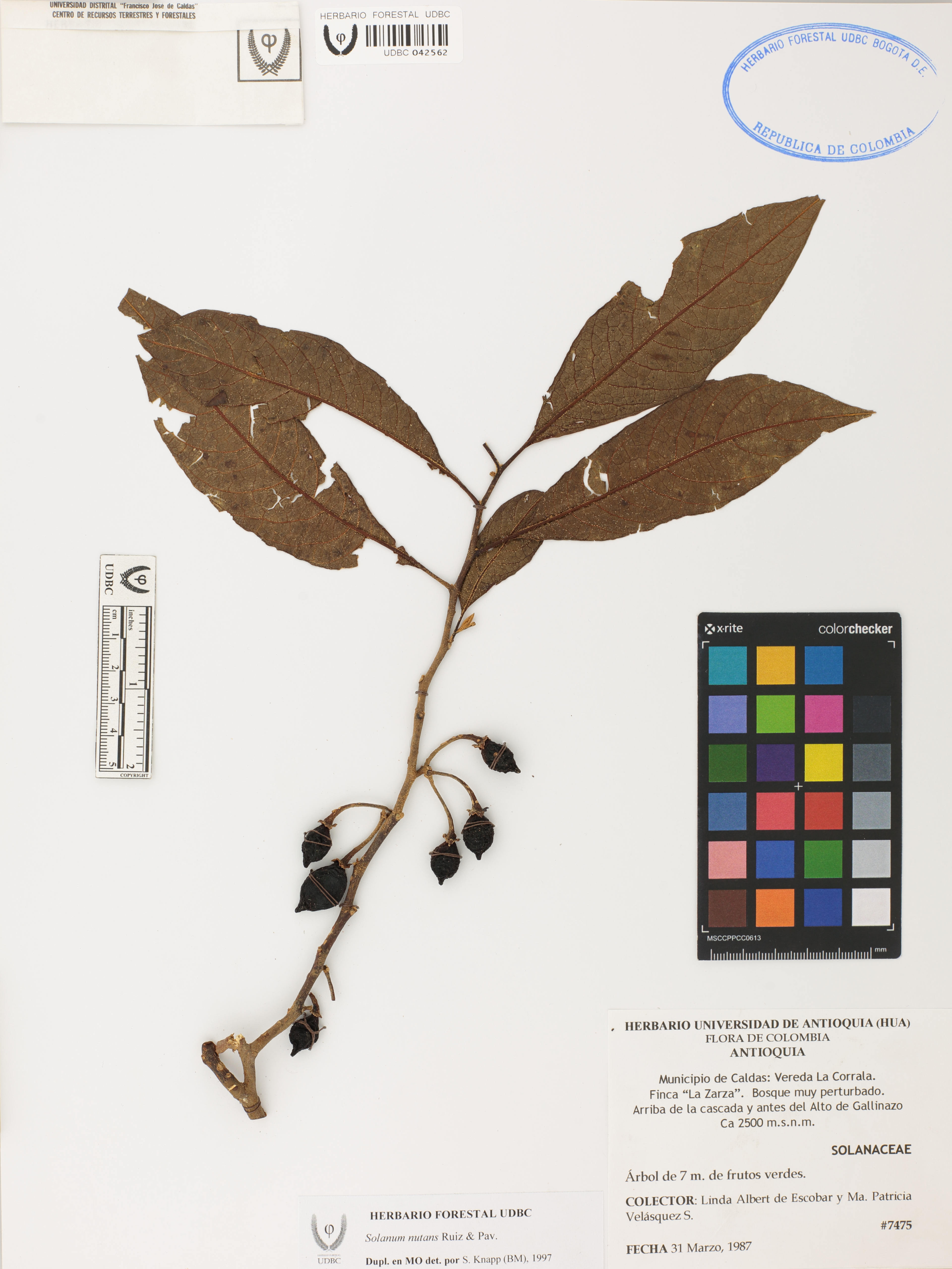 Fotografía del ejemplar Albert de Escobar, L. 7475, determinado como Solanum nutans en el año 1997