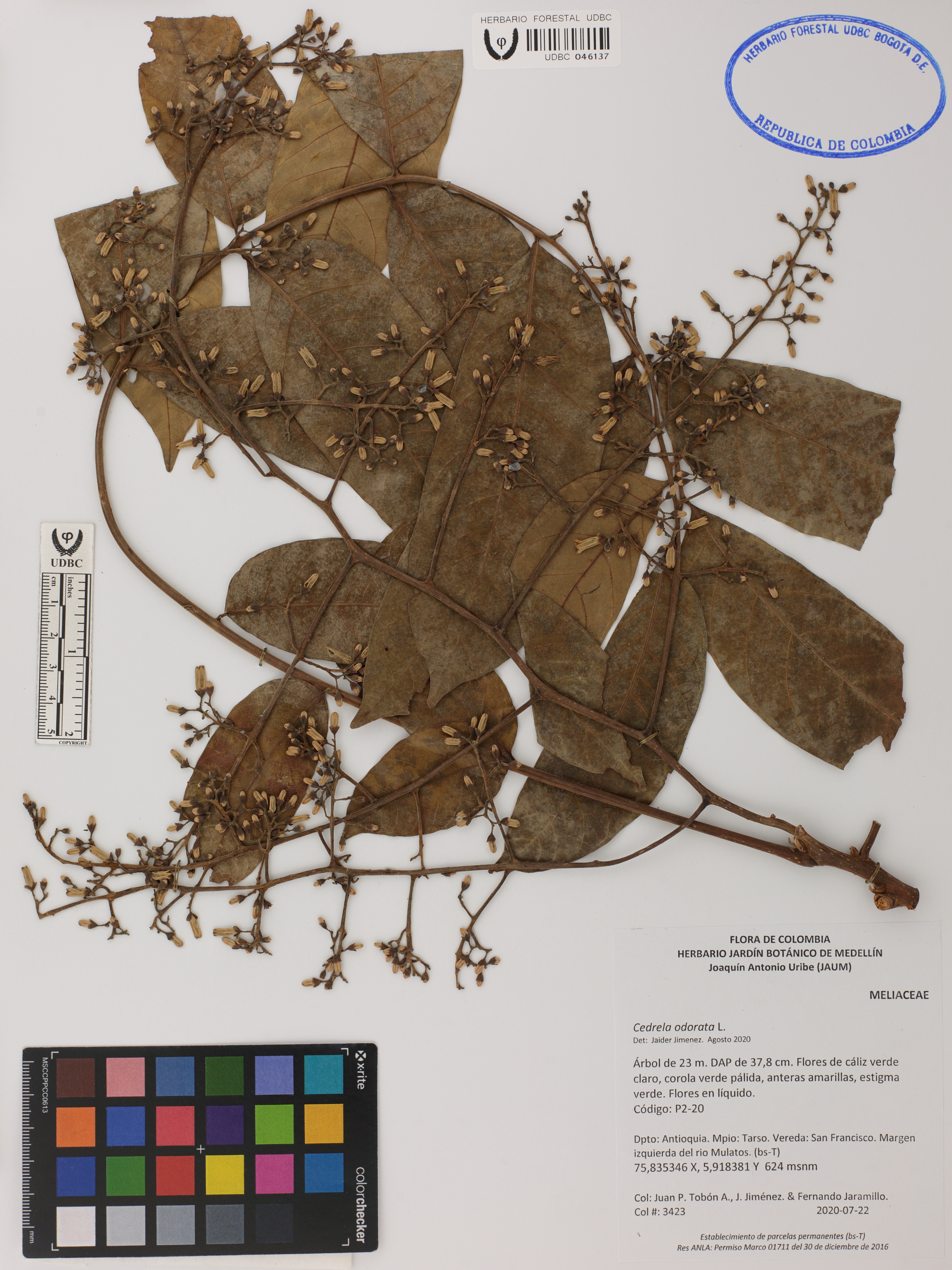 Fotografía del ejemplar Tobón-Agudelo, J. 3423, determinado como Cedrela odorata en el año 2020