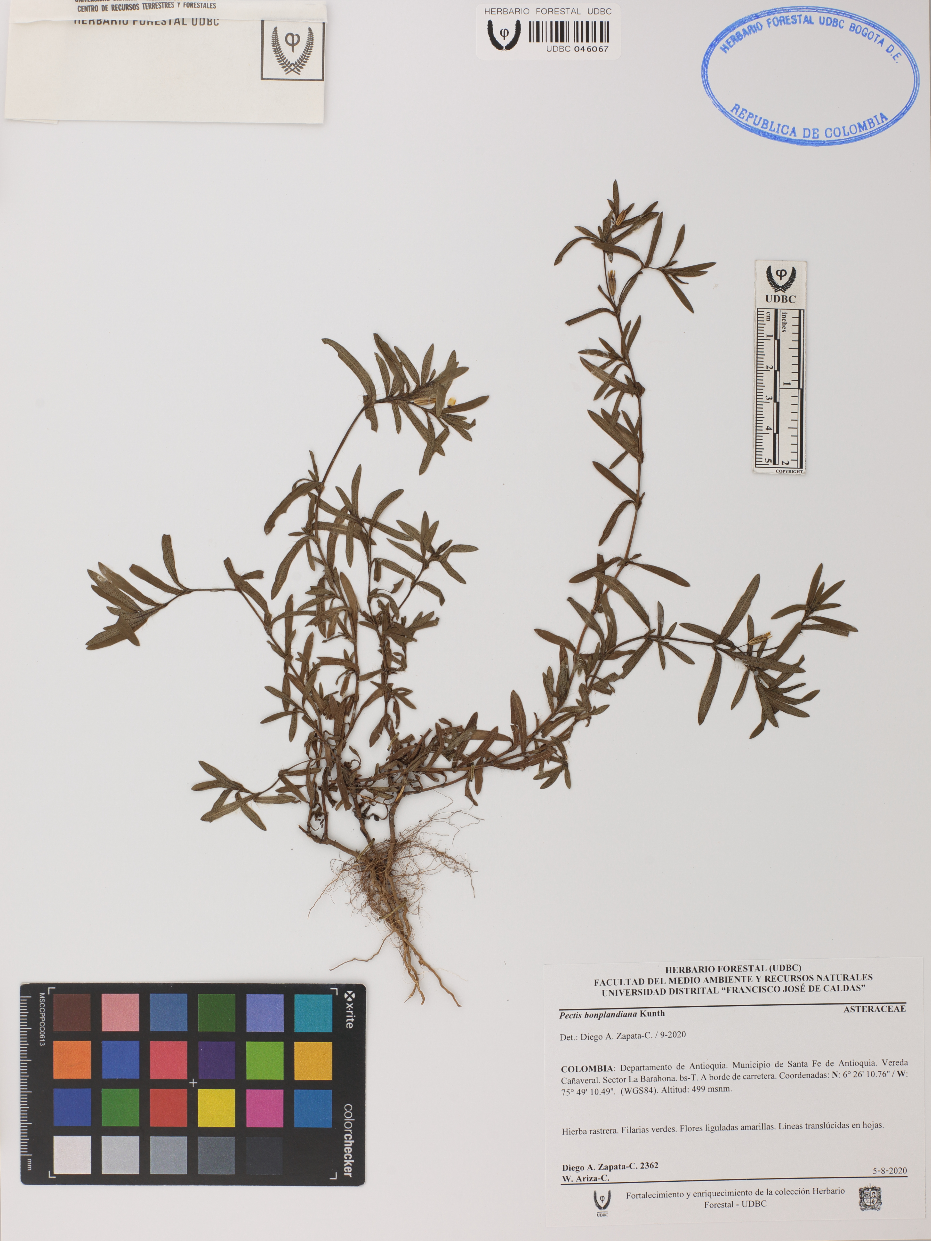 Fotografía del ejemplar Zapata-C., D. 2362, determinado como Pectis bonplandiana en el año 2020