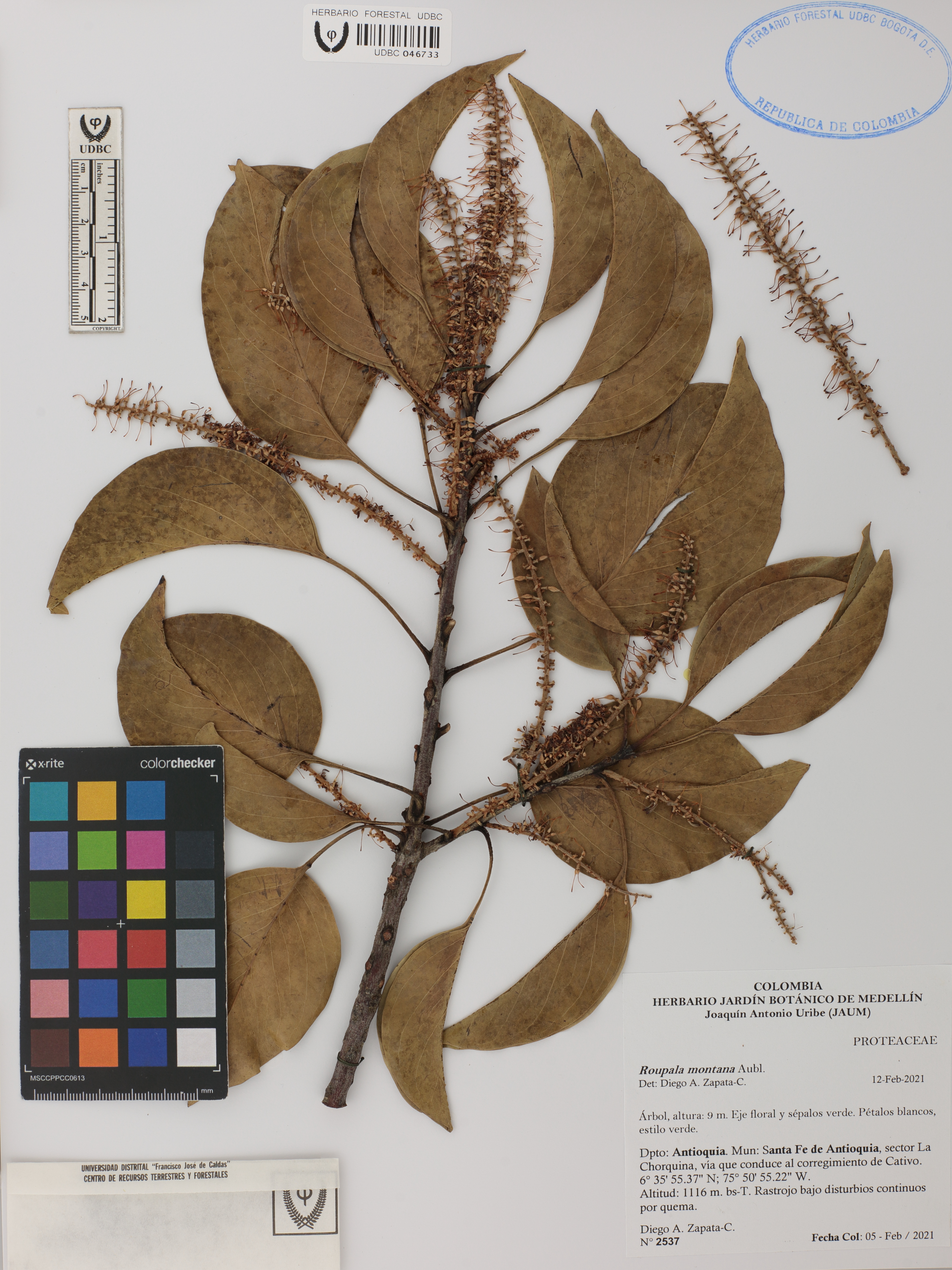 Fotografía del ejemplar Zapata-C., D. 2537, determinado como Roupala montana en el año 2021