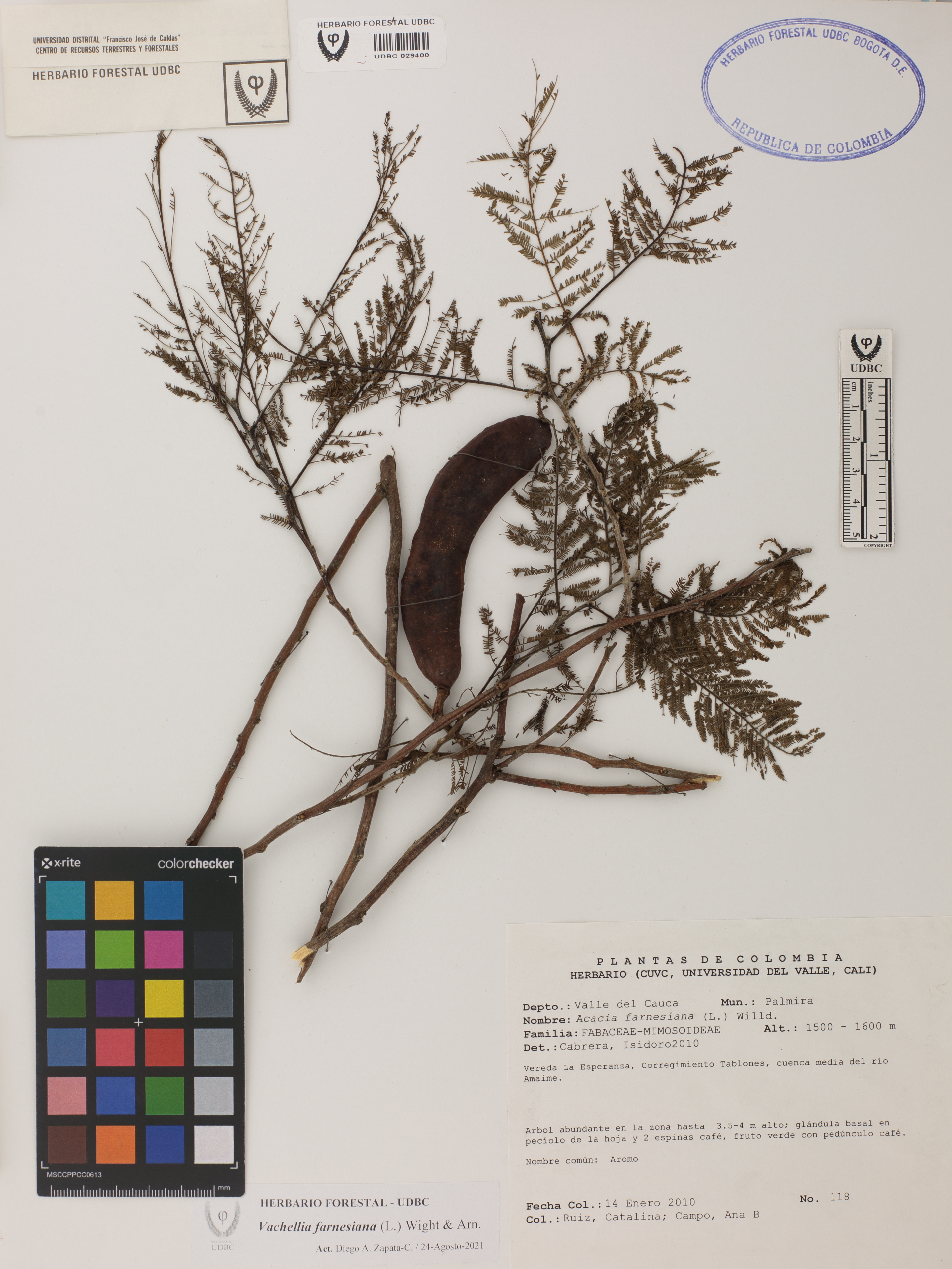Fotografía del ejemplar Ruiz, C. 118, determinado como Vachellia farnesiana en el año 2010