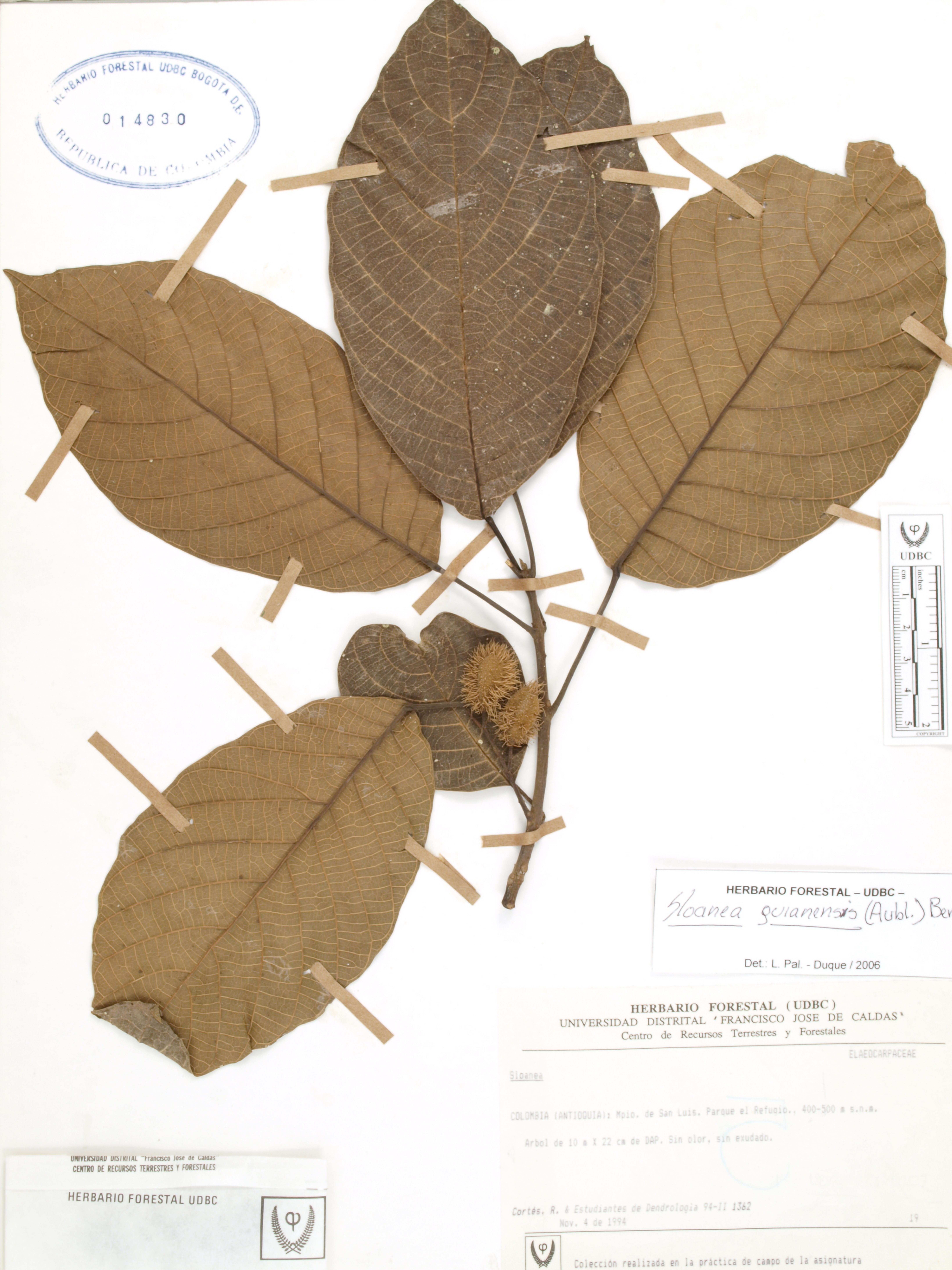 Fotografía del ejemplar Cortés-B., R. 1362, determinado como Sloanea guianensis en el año 2006
