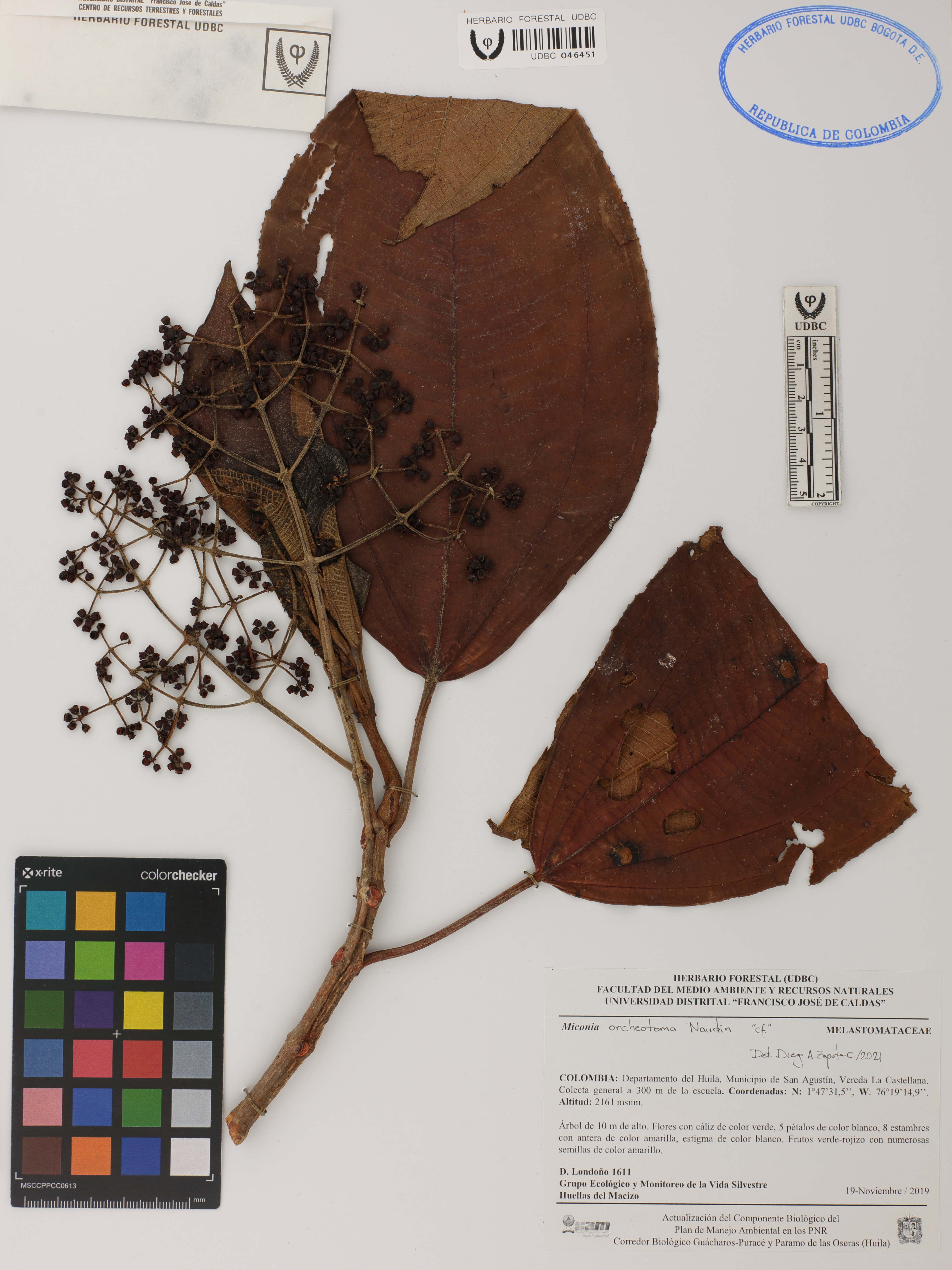 Fotografía del ejemplar Londoño, D. 1611, determinado como Miconia orcheotoma en el año 2021