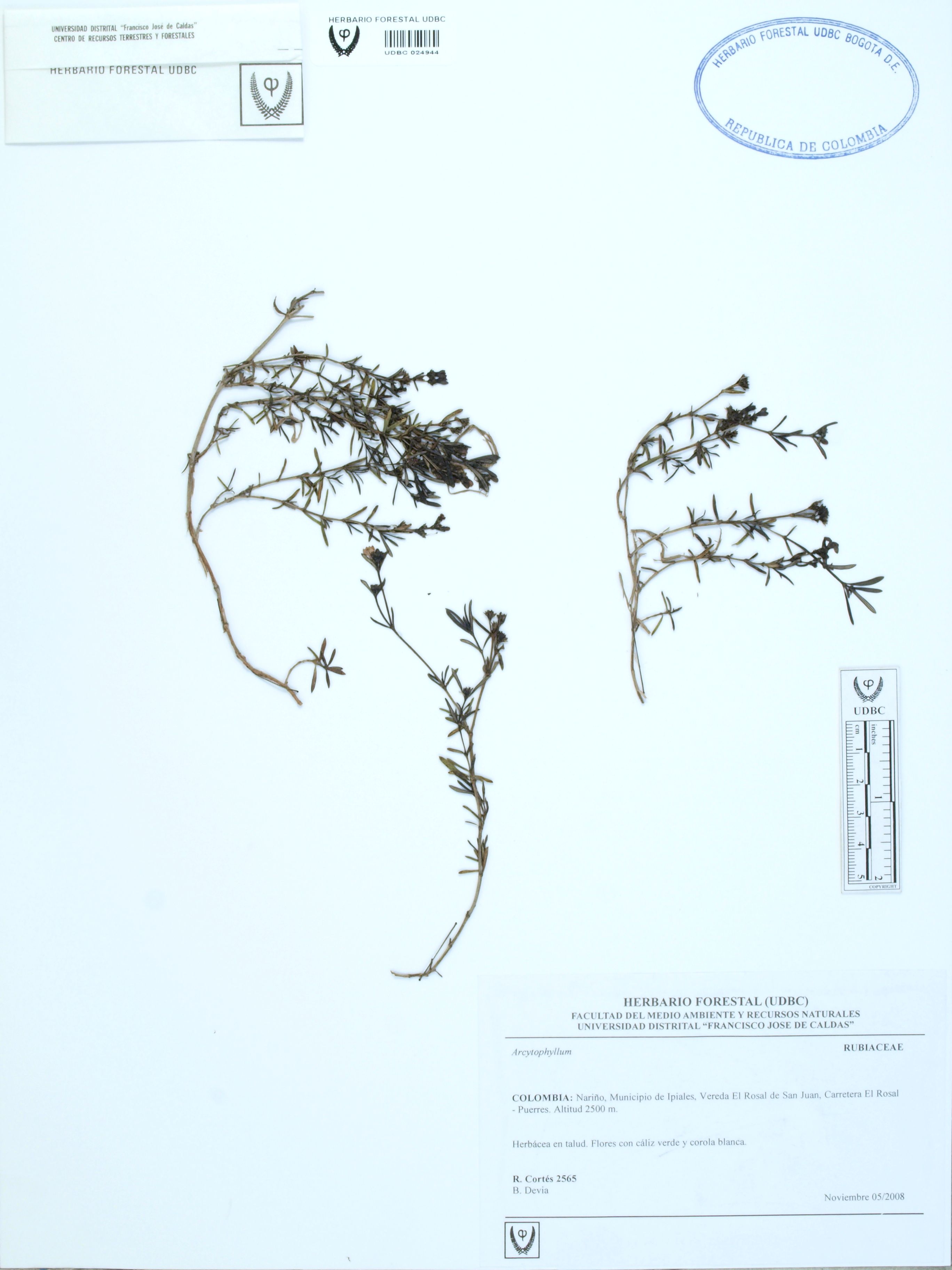 | dc.description | Fotografía del ejemplar Cortés-B., R. 2565, determinado como Arcytophyllum sp. | |