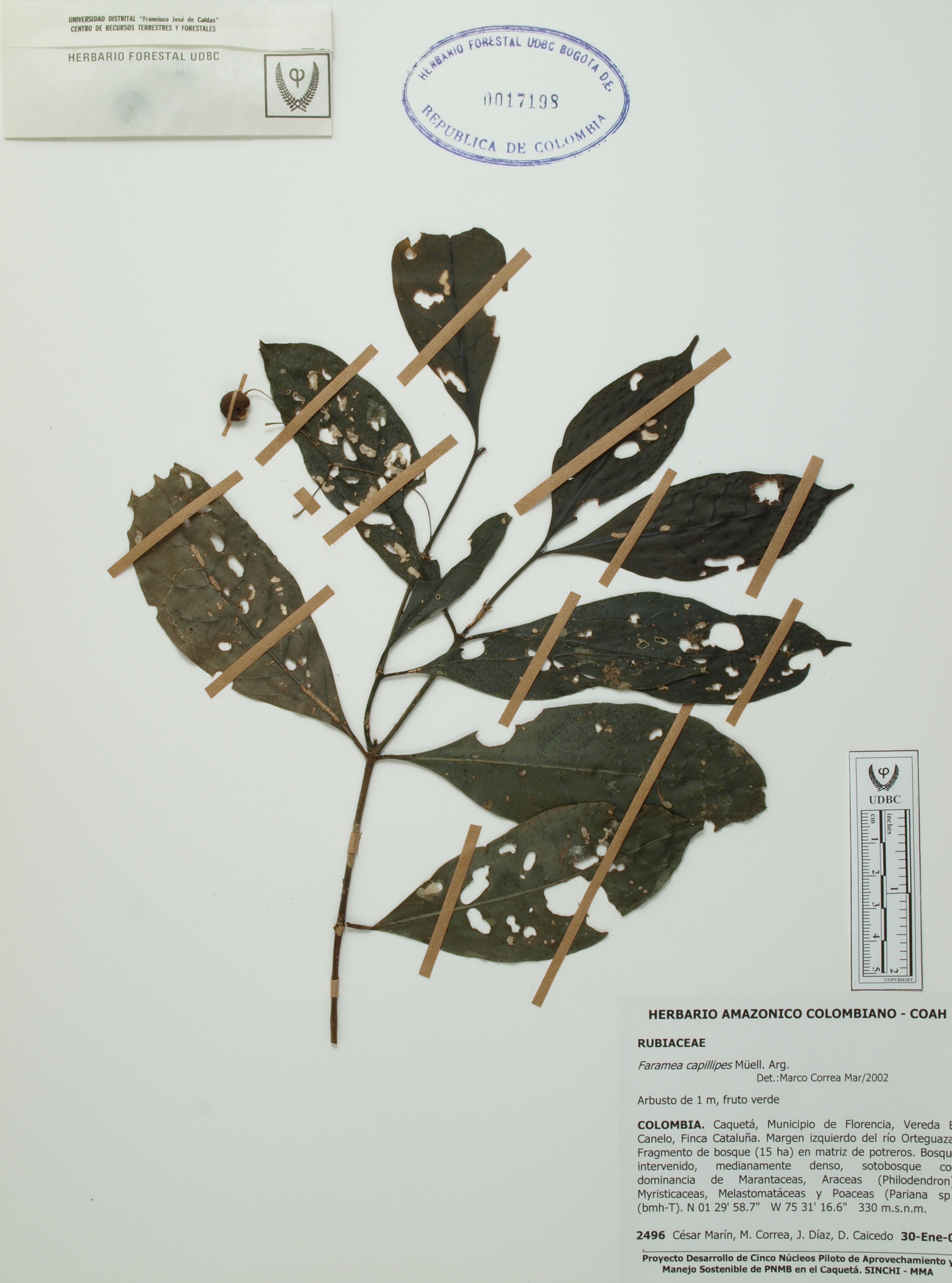 Fotografía del ejemplar Marín, C. 2496, determinado como Faramea capillipes en el año 2002