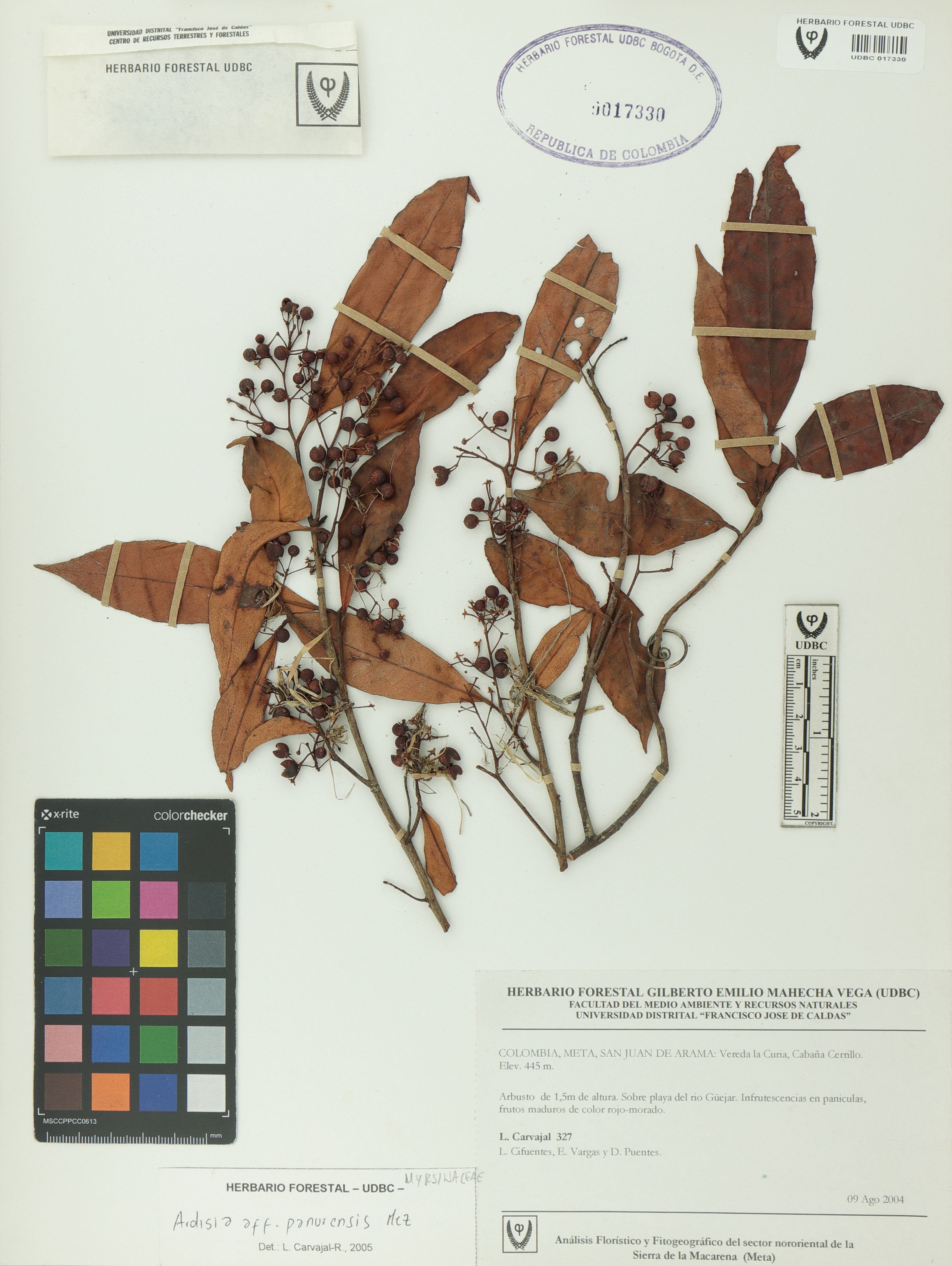 | dc.description | Fotografía del ejemplar Carvajal, L. 327, determinado como Ardisia panurensis en el año 2005 | |