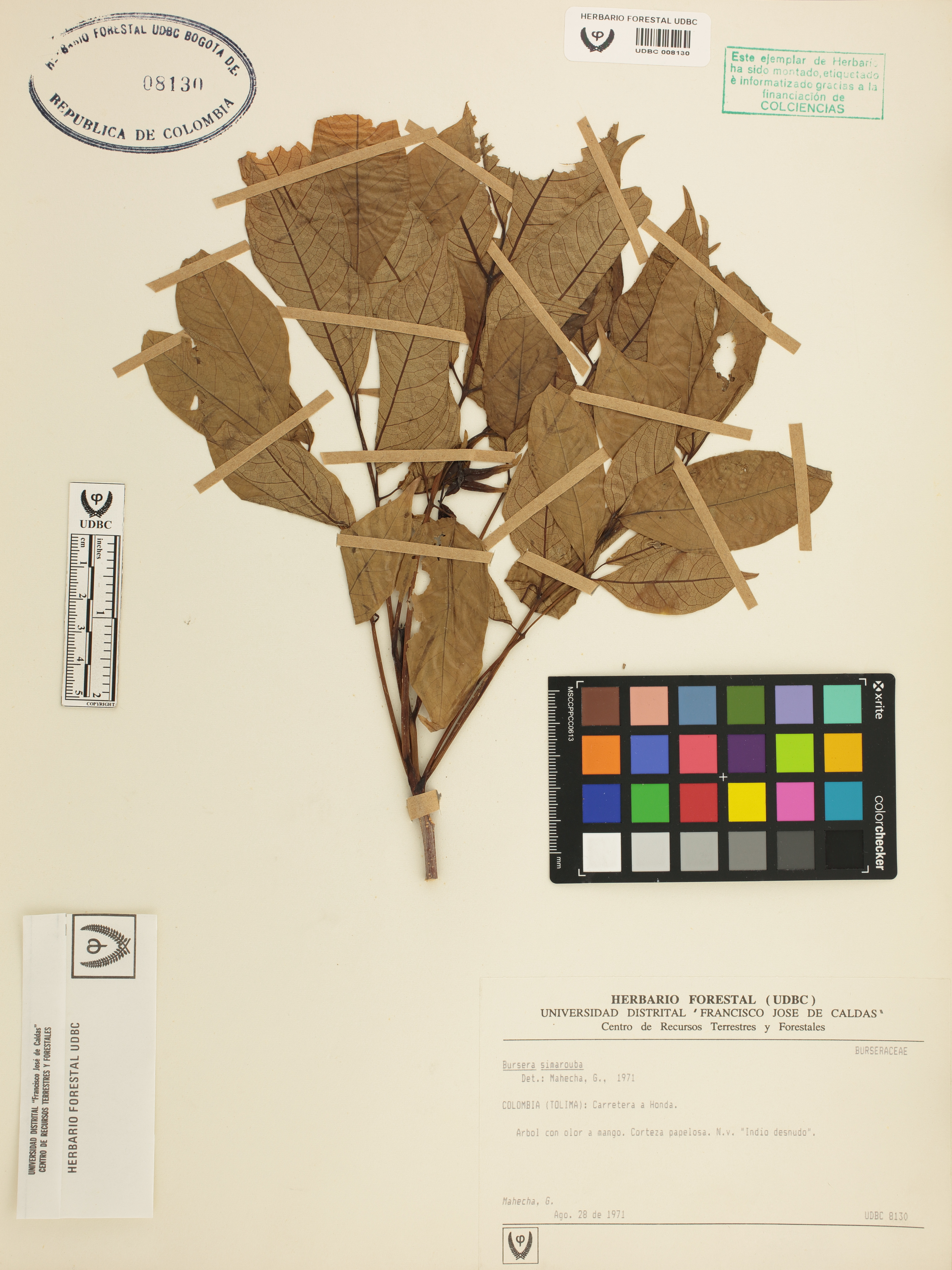 Fotografía del ejemplar Mahecha, G., determinado como Bursera simaruba en el año 1971
