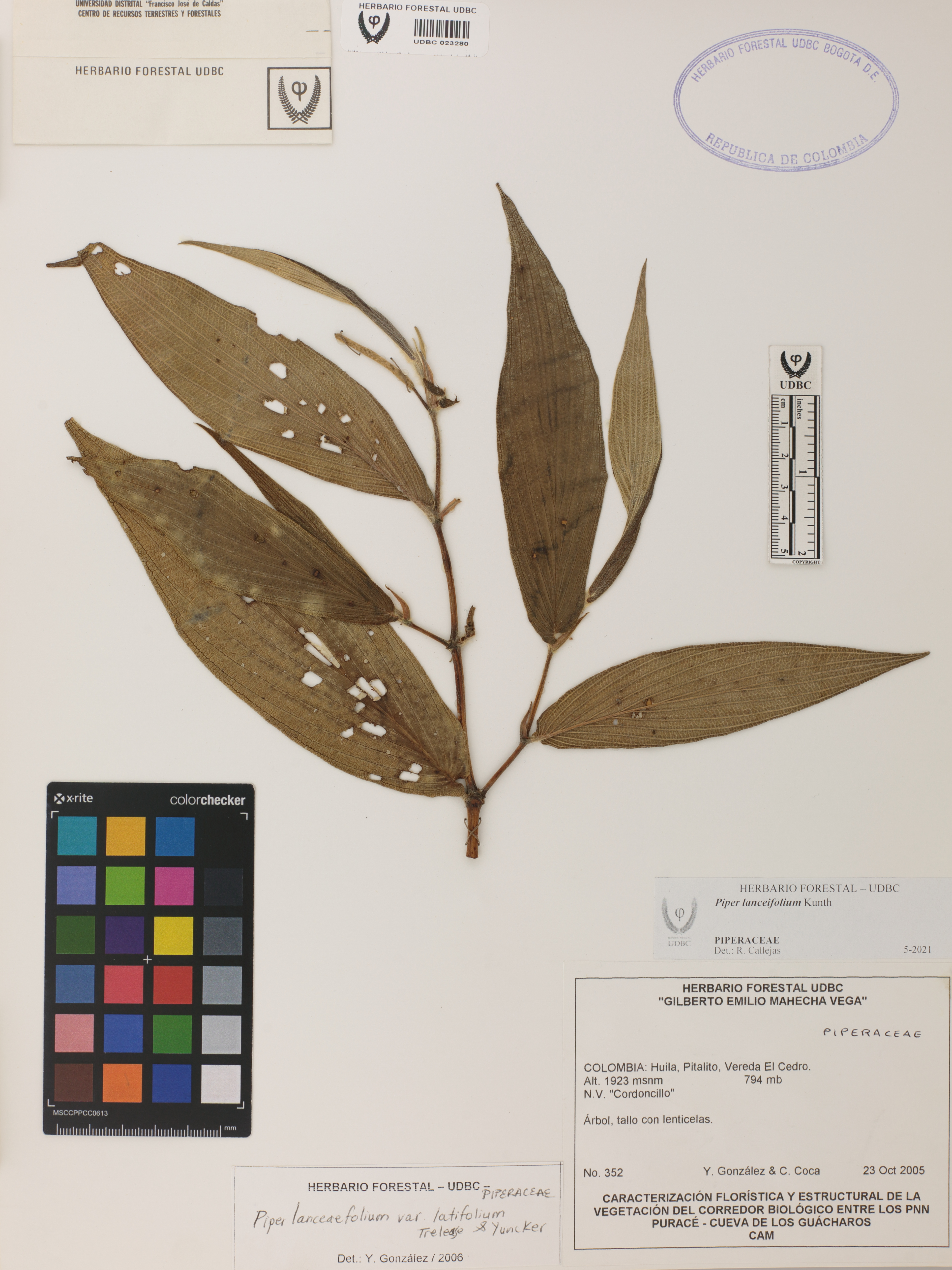 Fotografía del ejemplar González, Y. 352, determinado como Piper lanceifolium en el año 2021