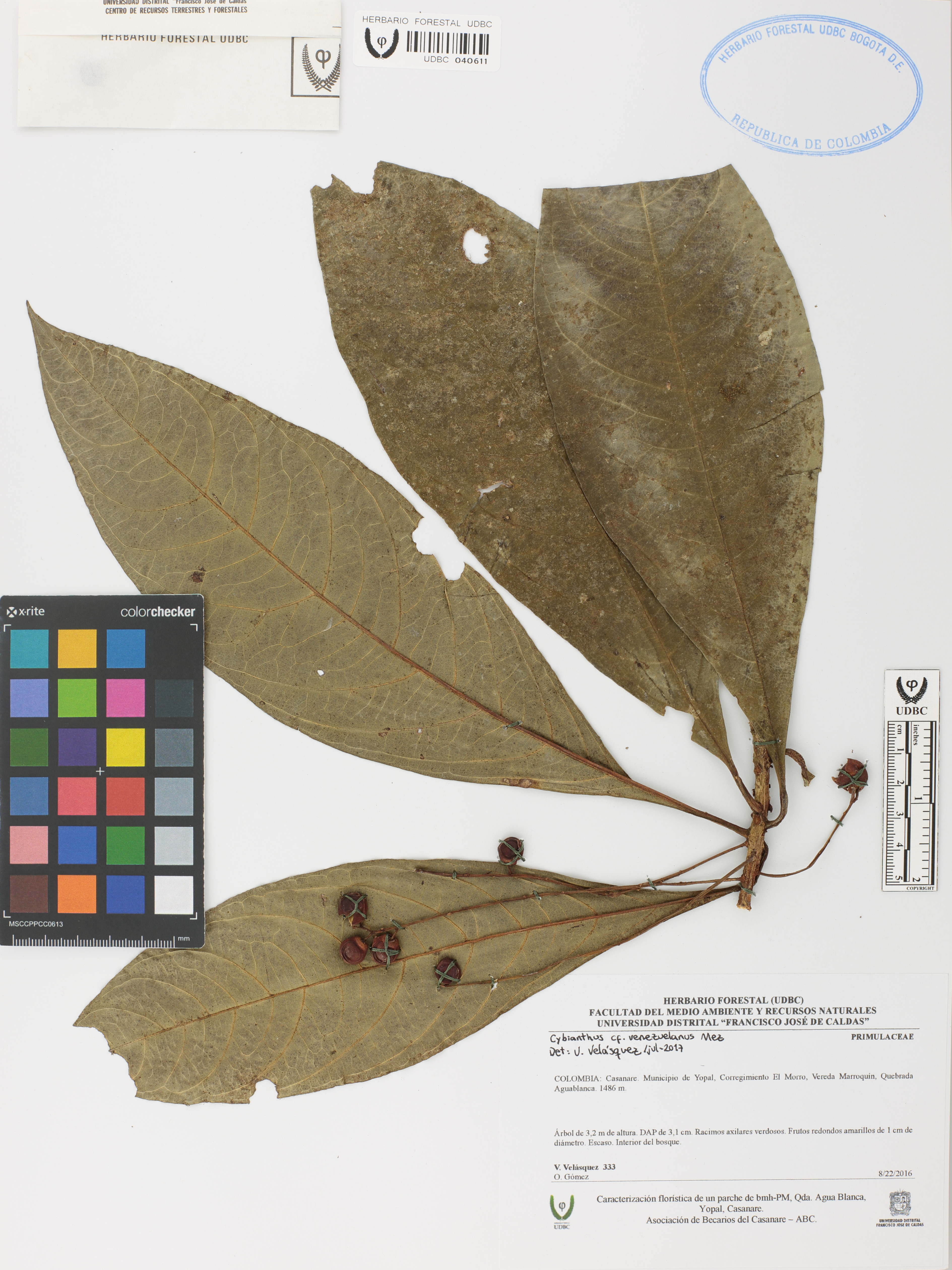 | dc.description | Fotografía del ejemplar Velásquez, V. 333, determinado como Cybianthus venezuelanus en el año 2017 | |