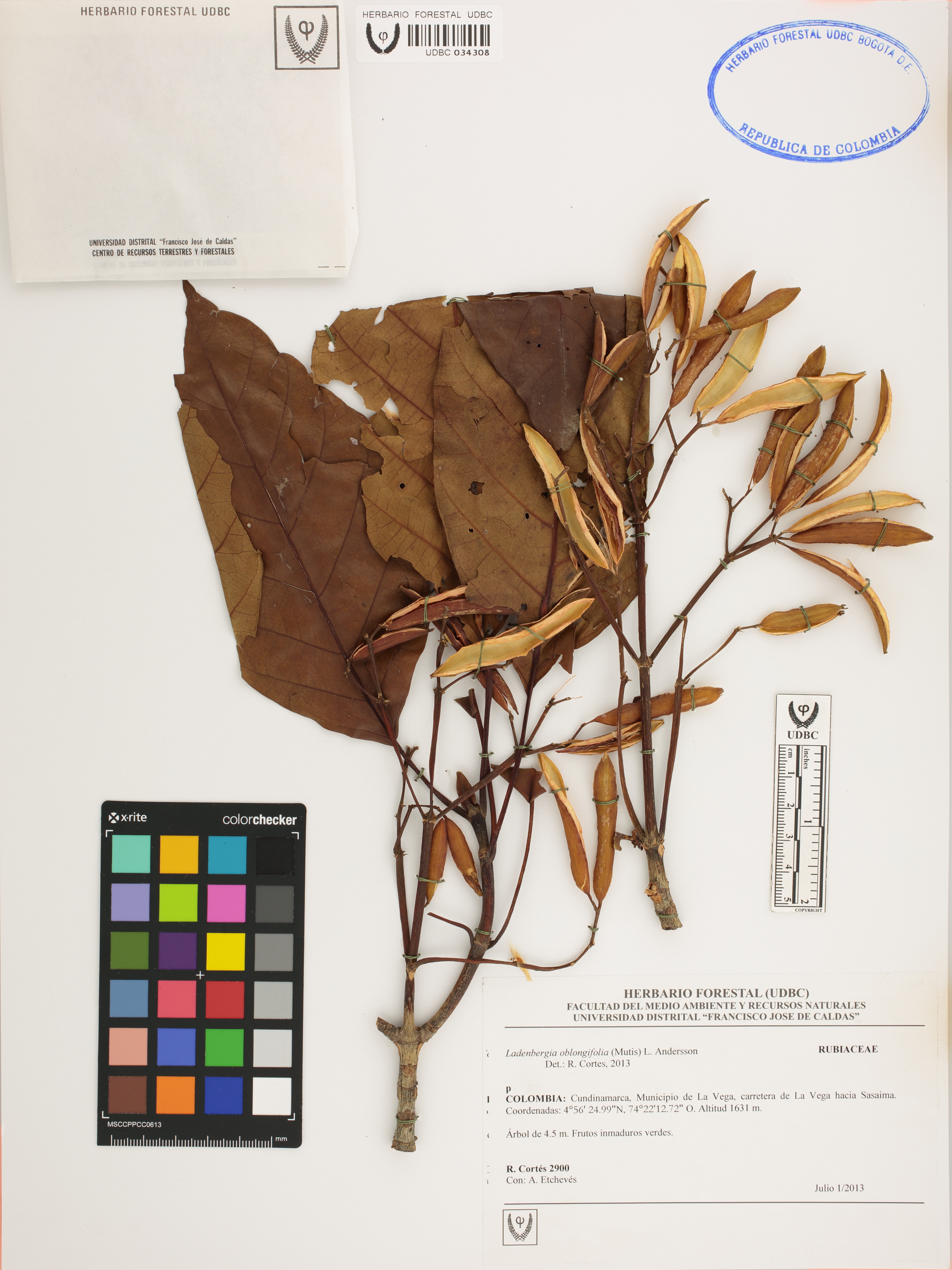 Fotografía del ejemplar Cortés, R. 2900, determinado como Ladenbergia oblongifolia en el año 2013